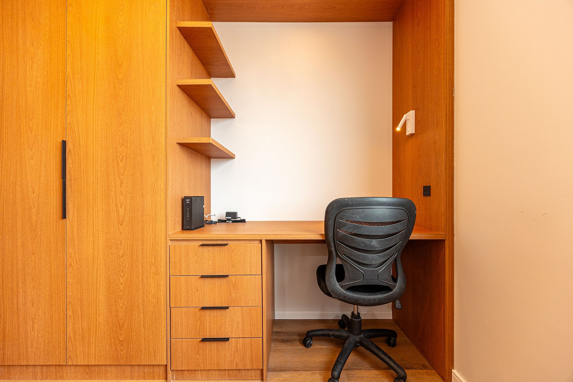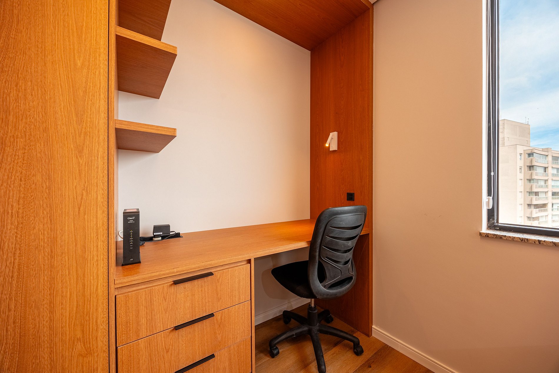 -O quarto foi projetado para o máximo conforto, c, ar-condicionado, armário embutido com espaço para malas e roupas e uma estação de trabalho funcional com cadeira ergonômica.