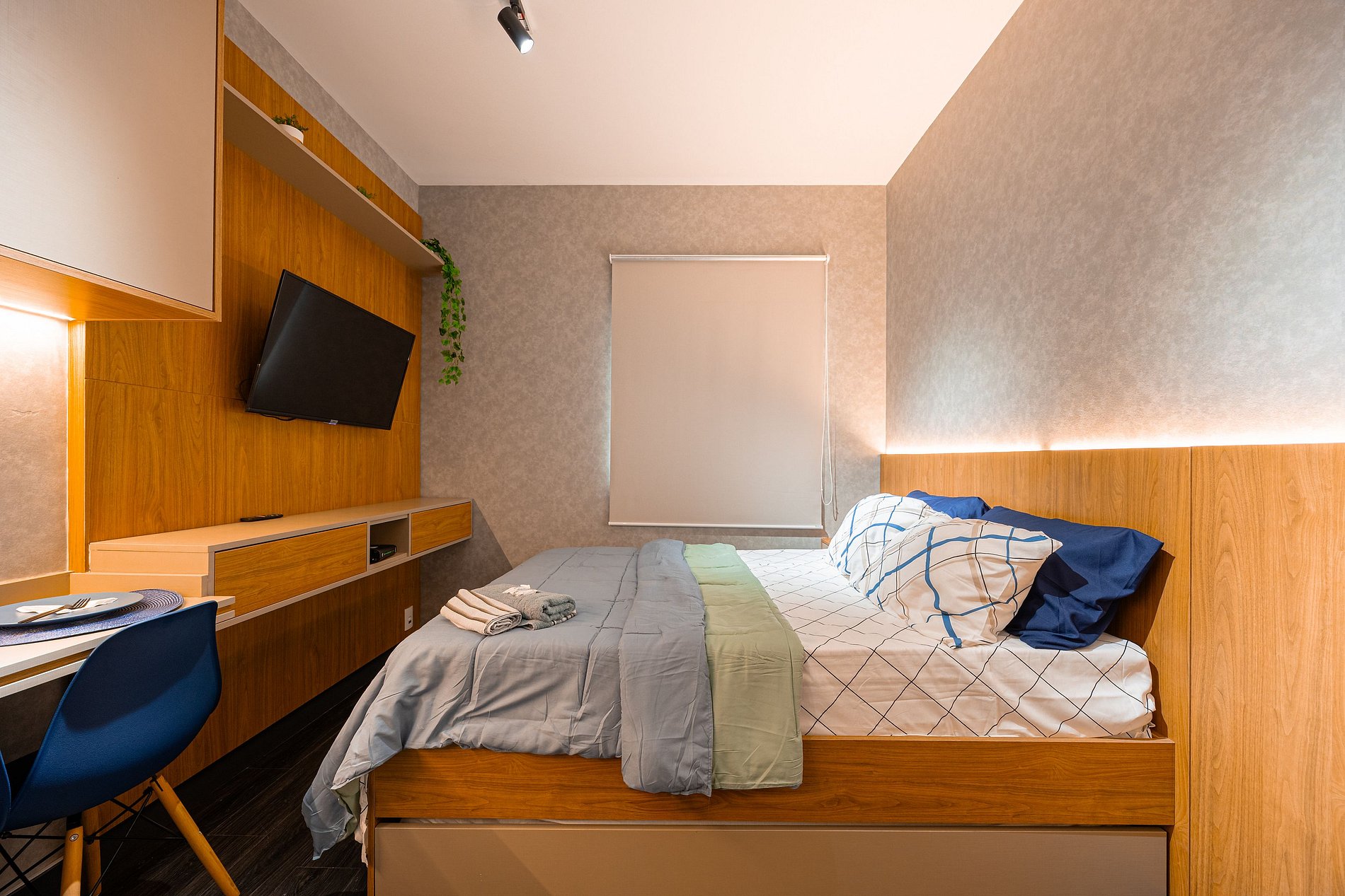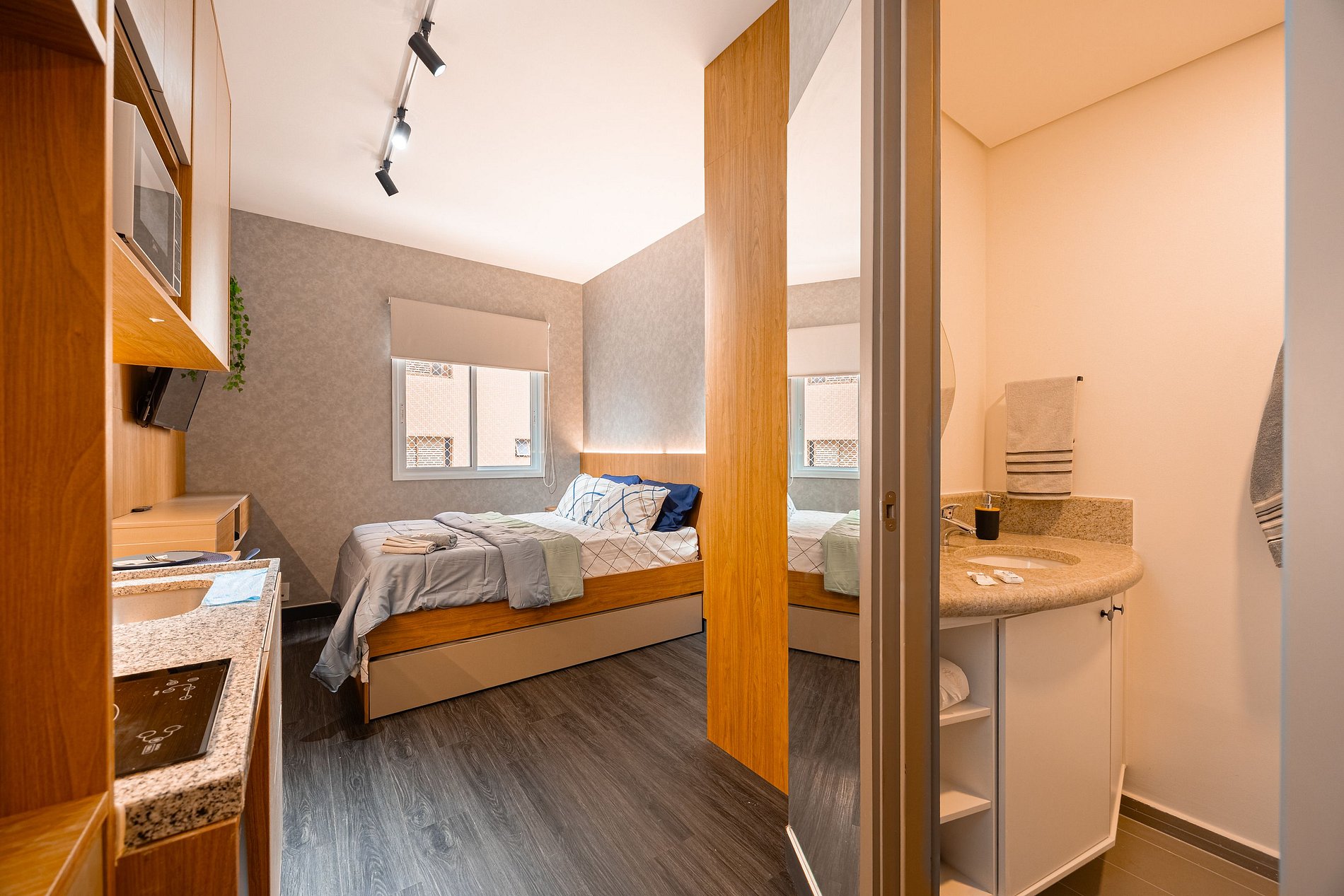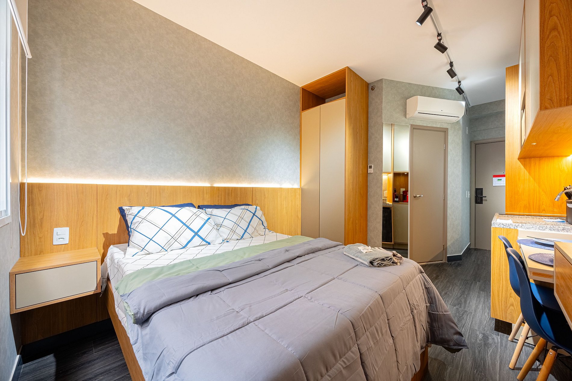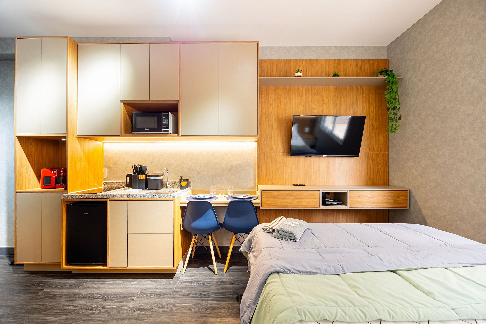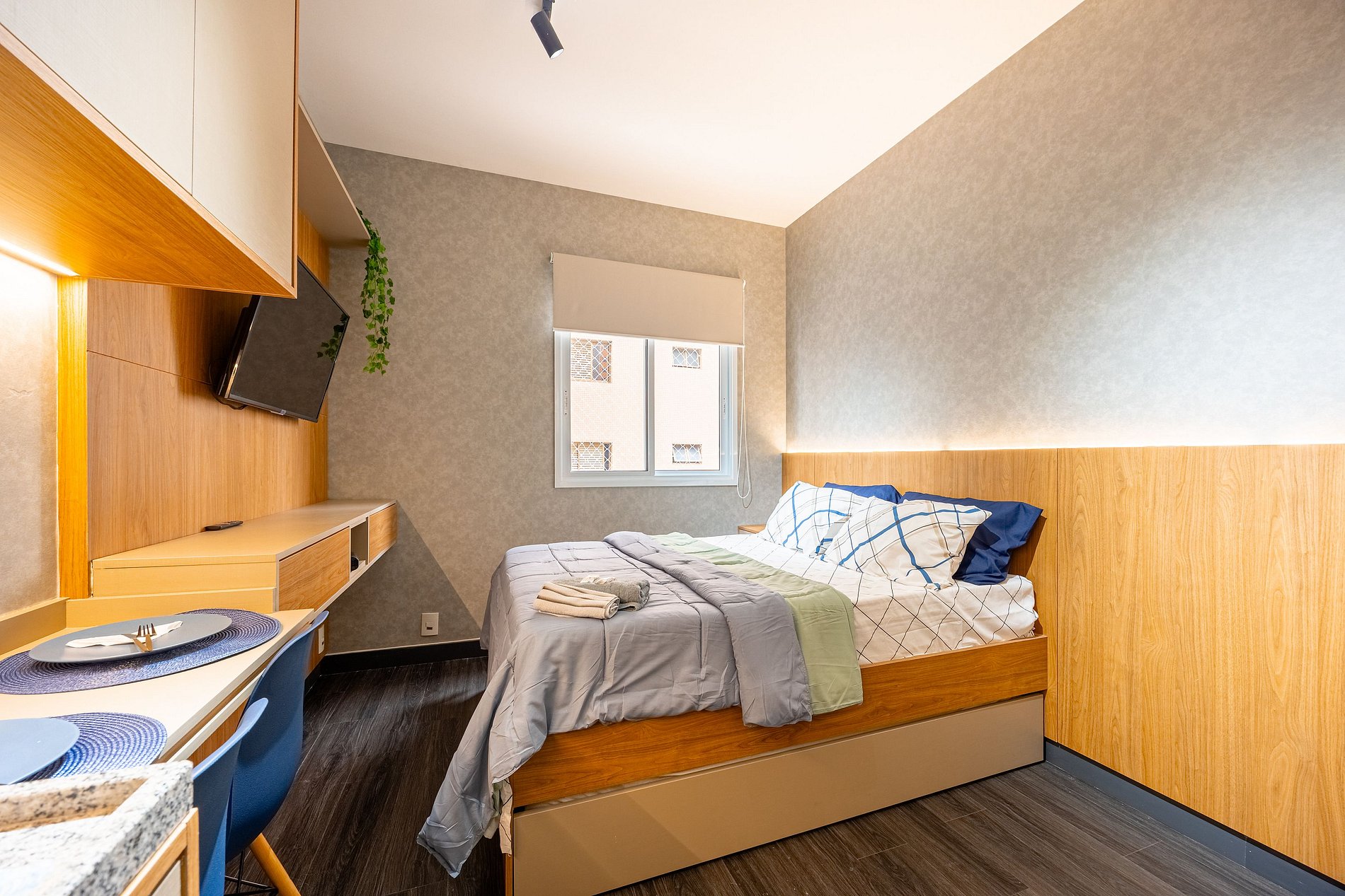 Estúdio estilo suíte, moderno e funcional, perfeito para quem busca conforto e praticidade. O espaço conta com closet, cabideiros, geladeira e diversas outras comodidades que garantem uma estadia agradável e eficiente. Ideal para estadias curtas ou longas, o ambiente foi pensado para oferecer bem-estar e organização no dia a dia.