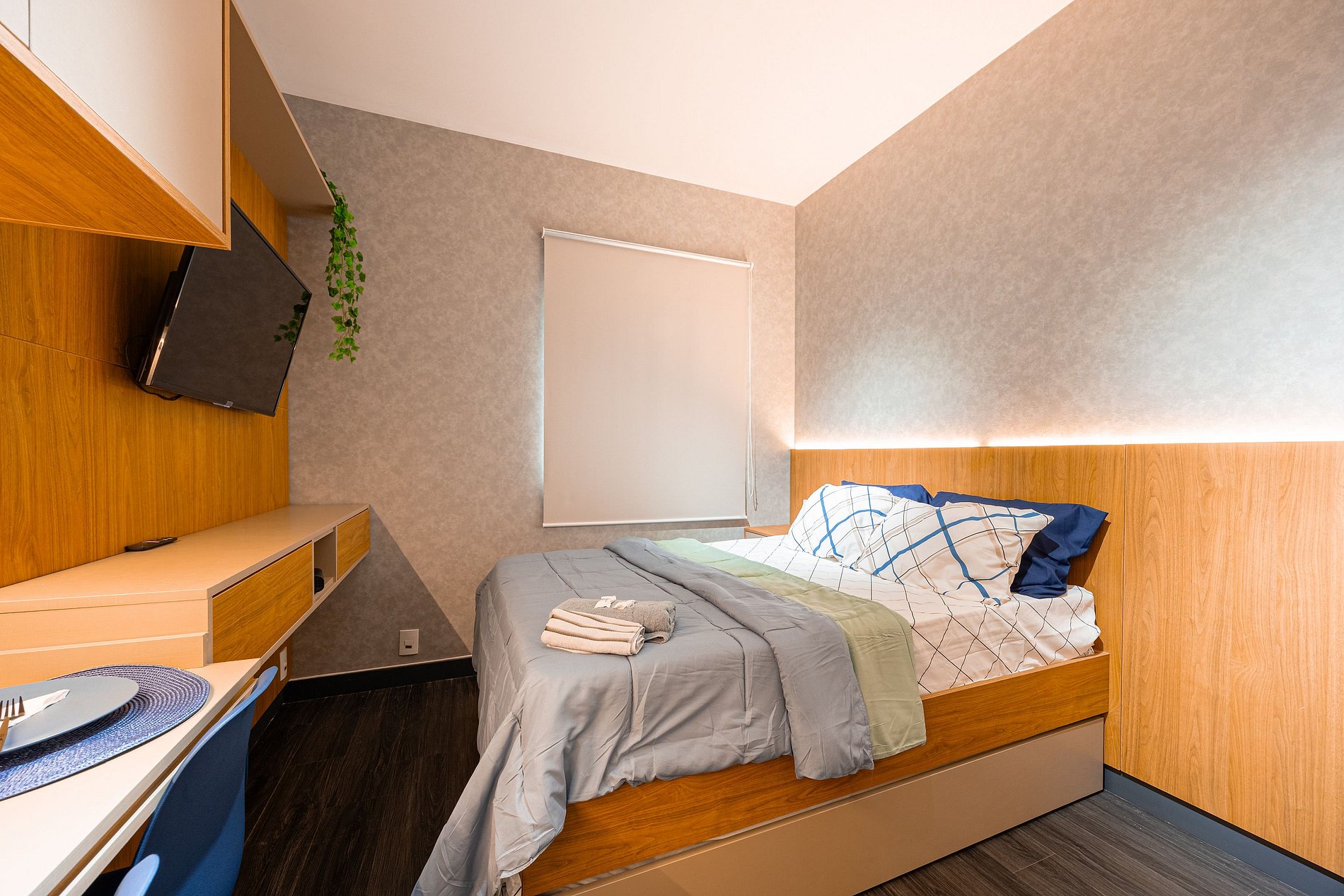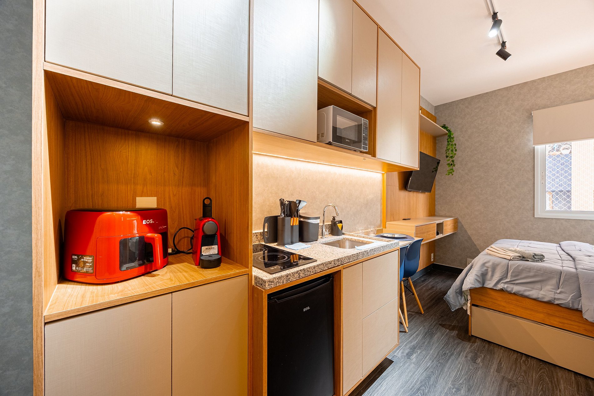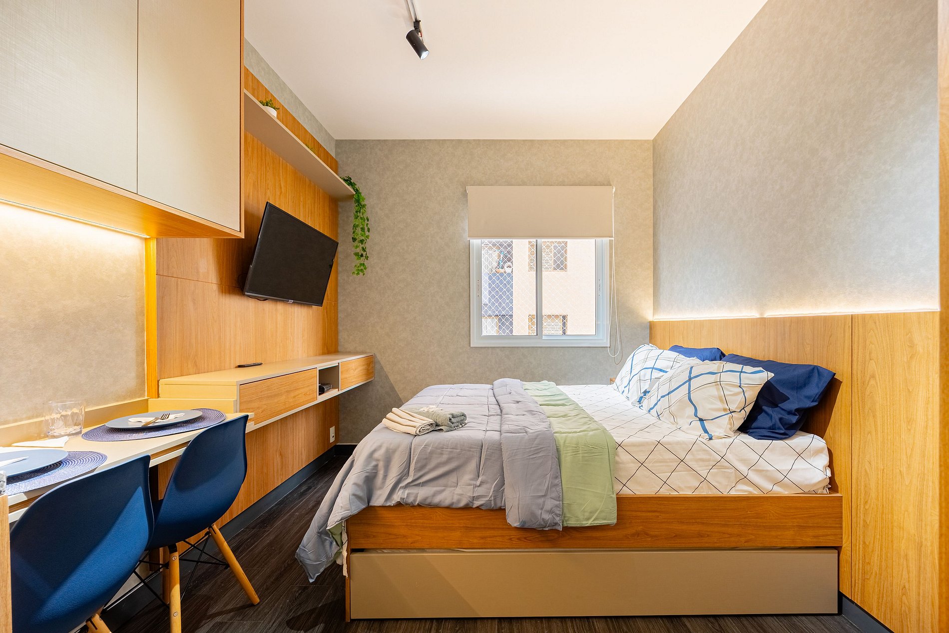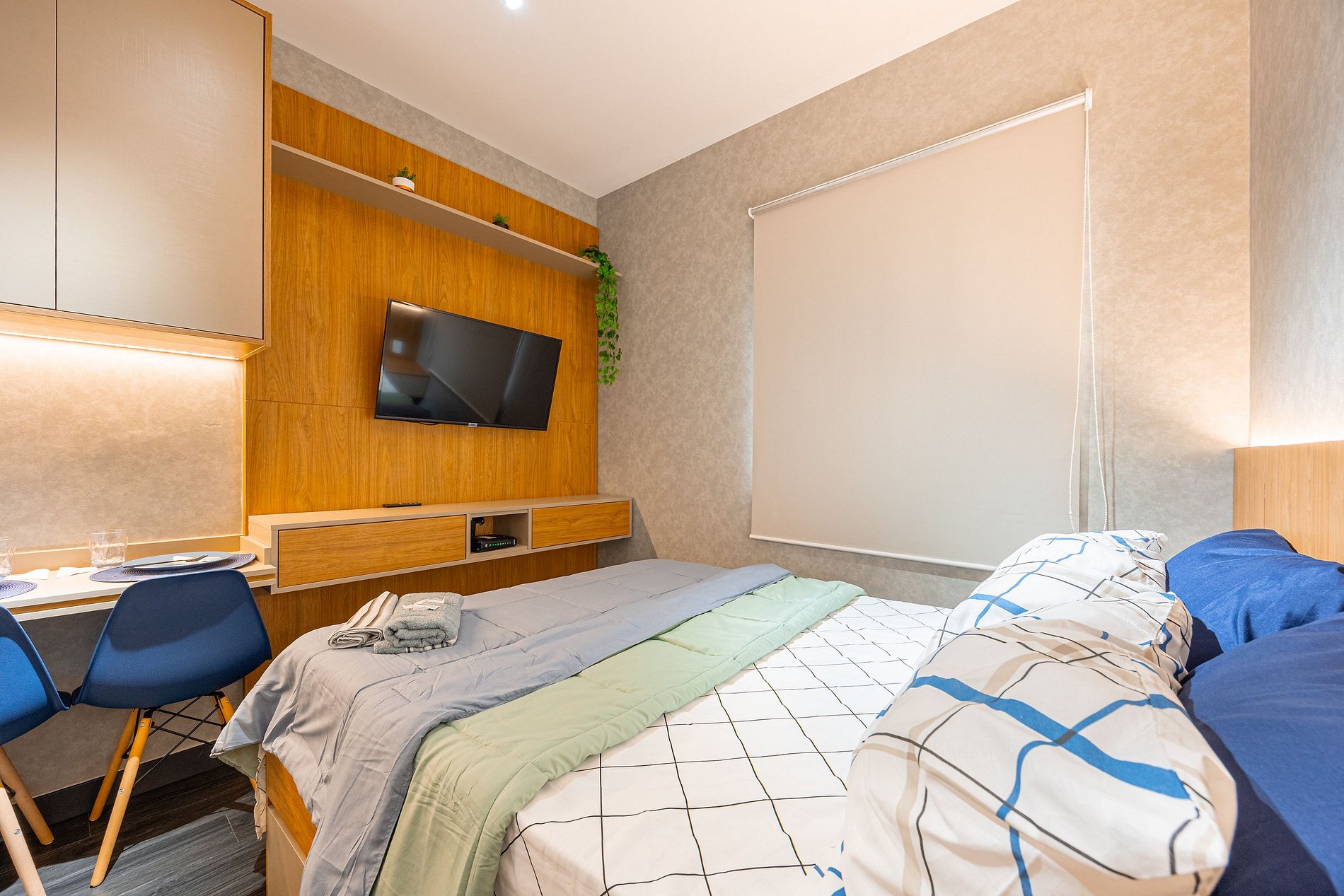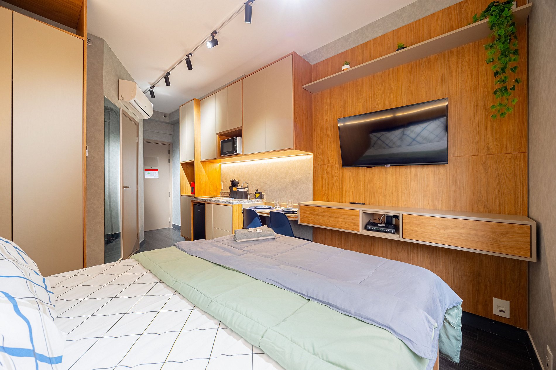 Estúdio estilo suíte, moderno e funcional, perfeito para quem busca conforto e praticidade. O espaço conta com closet, cabideiros, geladeira e diversas outras comodidades que garantem uma estadia agradável e eficiente. Ideal para estadias curtas ou longas, o ambiente foi pensado para oferecer bem-estar e organização no dia a dia.