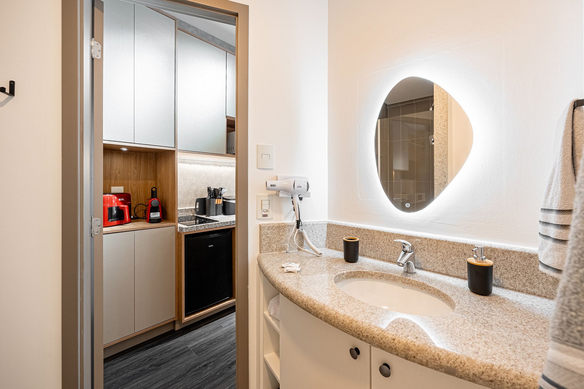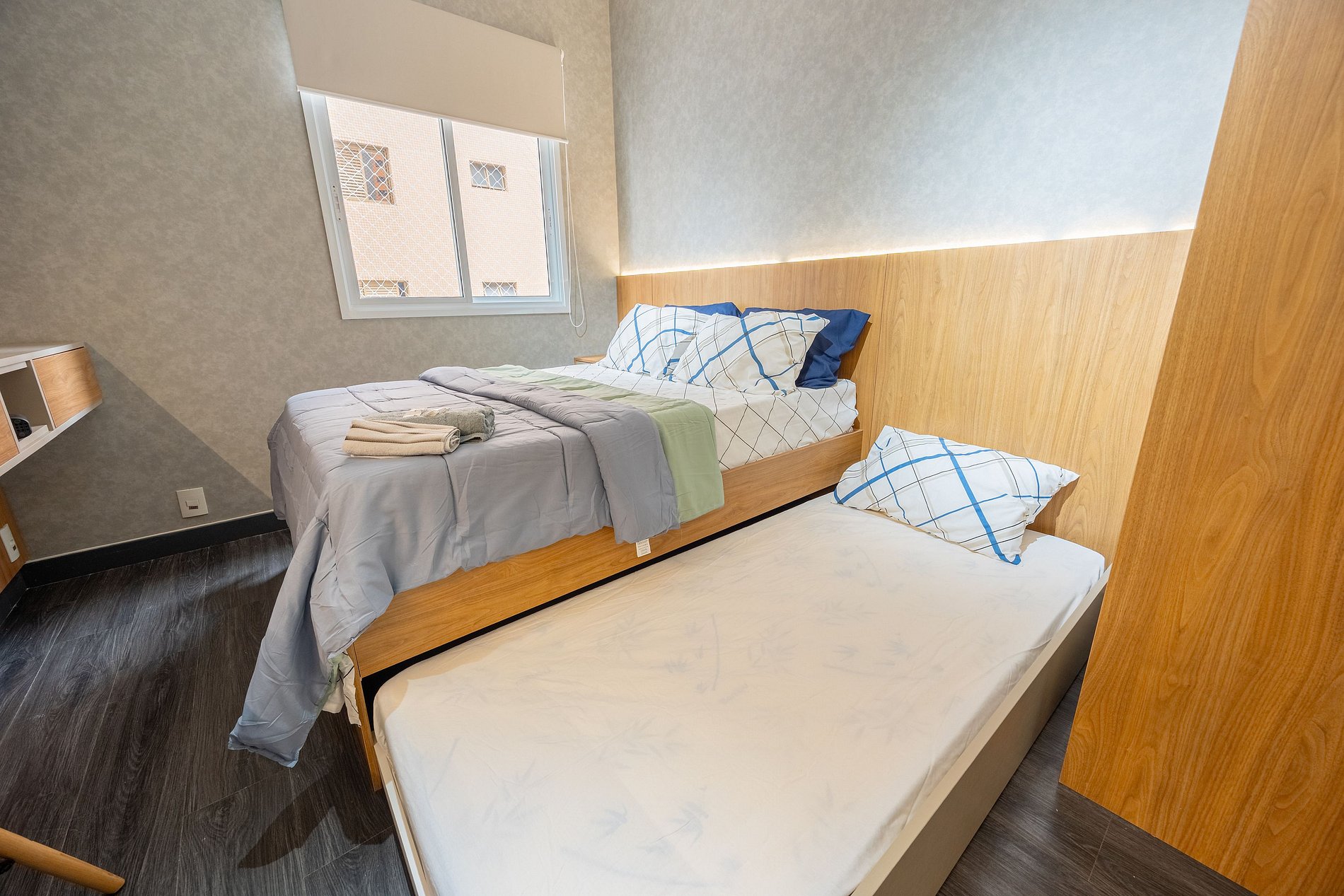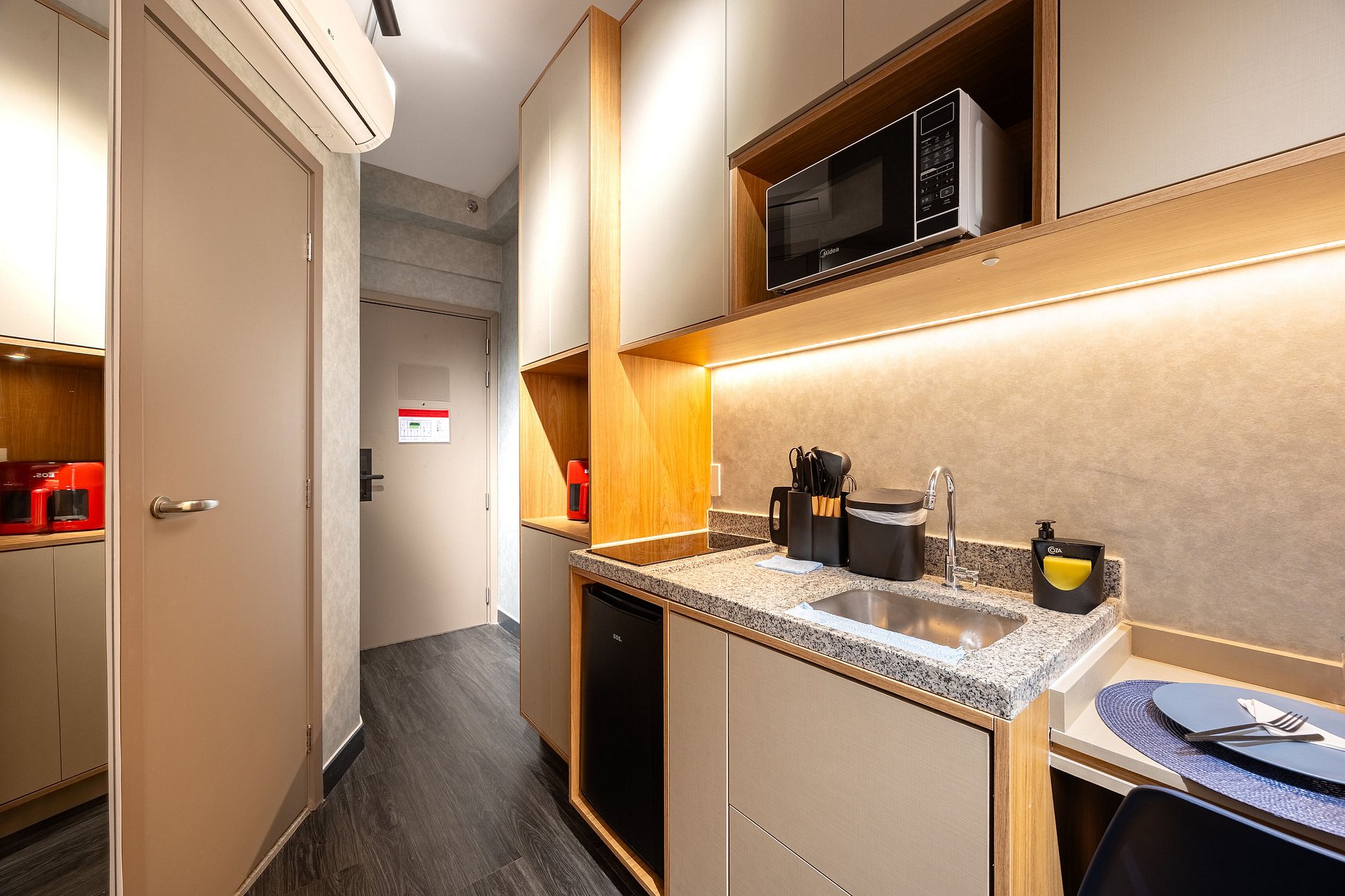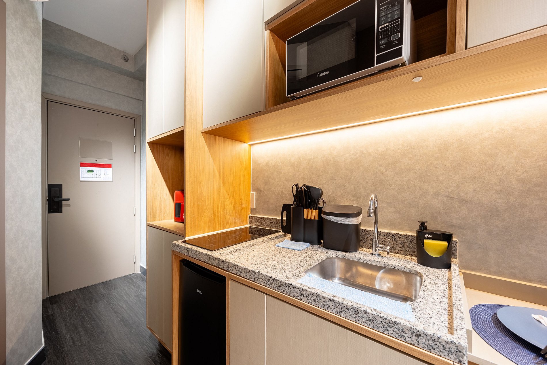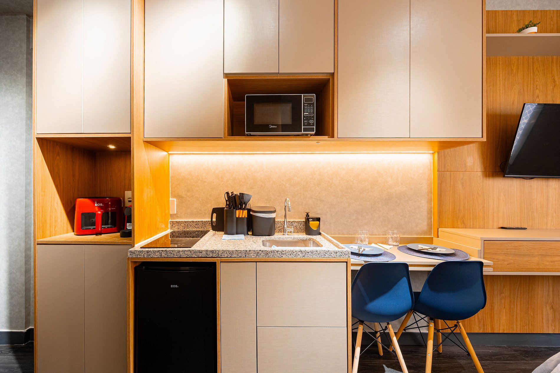 Estúdio estilo suíte, moderno e funcional, perfeito para quem busca conforto e praticidade. O espaço conta com closet, cabideiros, geladeira e diversas outras comodidades que garantem uma estadia agradável e eficiente. Ideal para estadias curtas ou longas, o ambiente foi pensado para oferecer bem-estar e organização no dia a dia.
