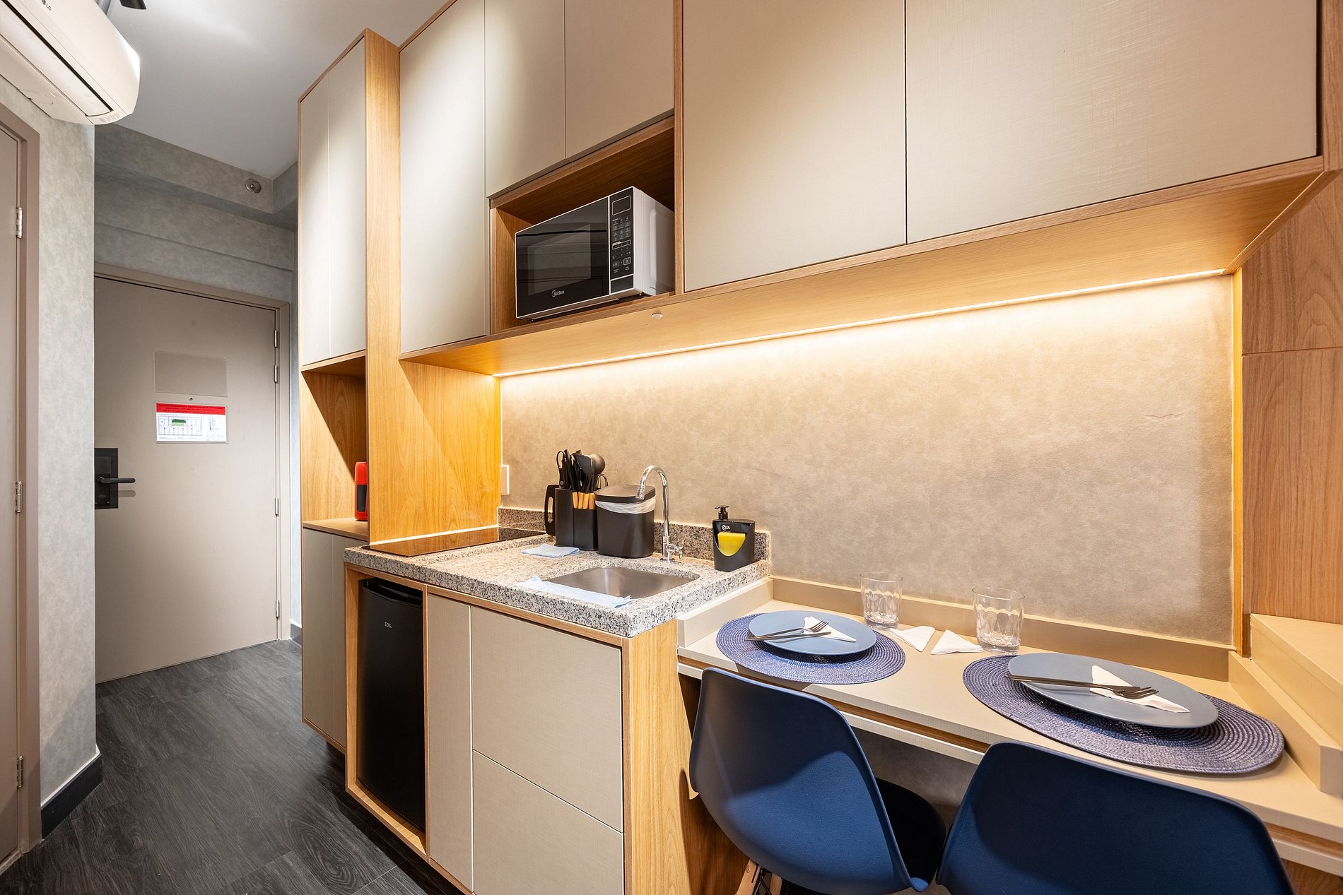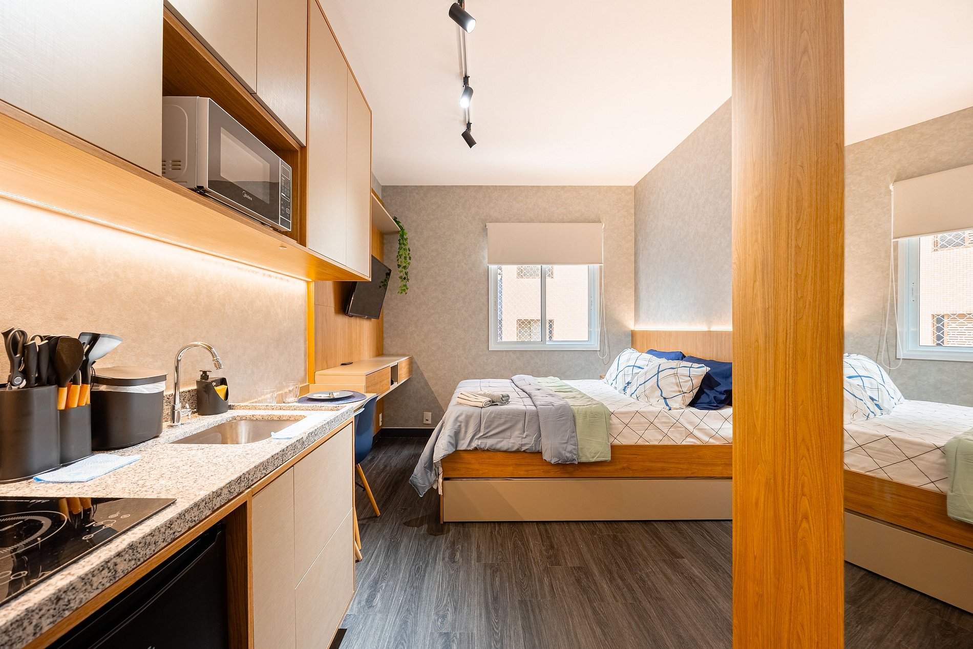 Estúdio estilo suíte, moderno e funcional, perfeito para quem busca conforto e praticidade. O espaço conta com closet, cabideiros, geladeira e diversas outras comodidades que garantem uma estadia agradável e eficiente. Ideal para estadias curtas ou longas, o ambiente foi pensado para oferecer bem-estar e organização no dia a dia.