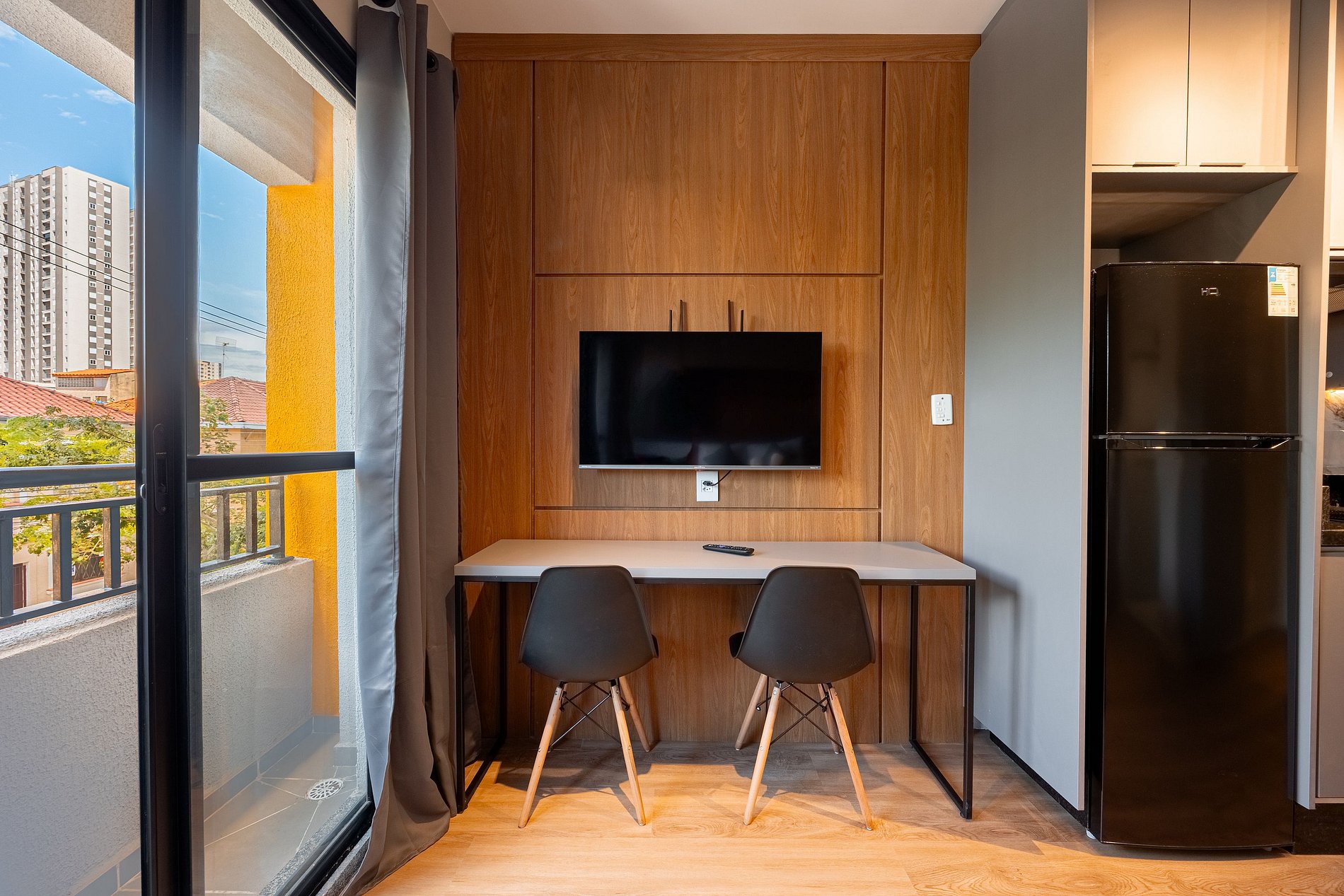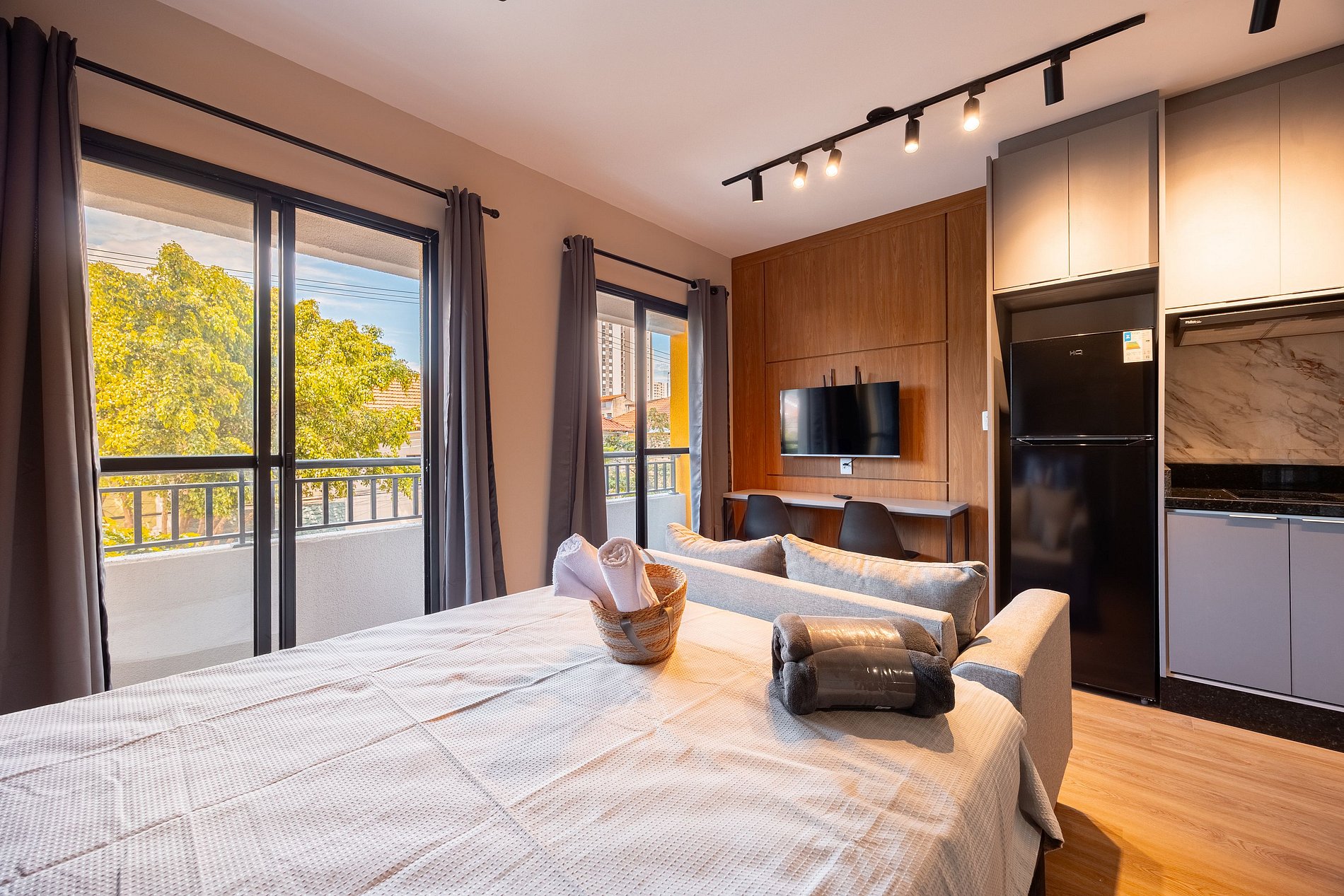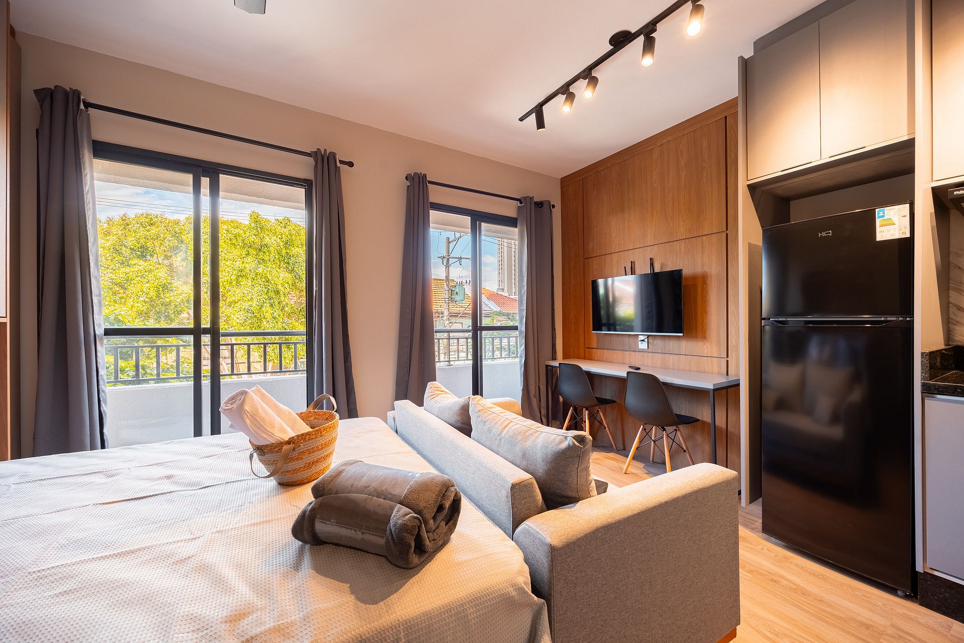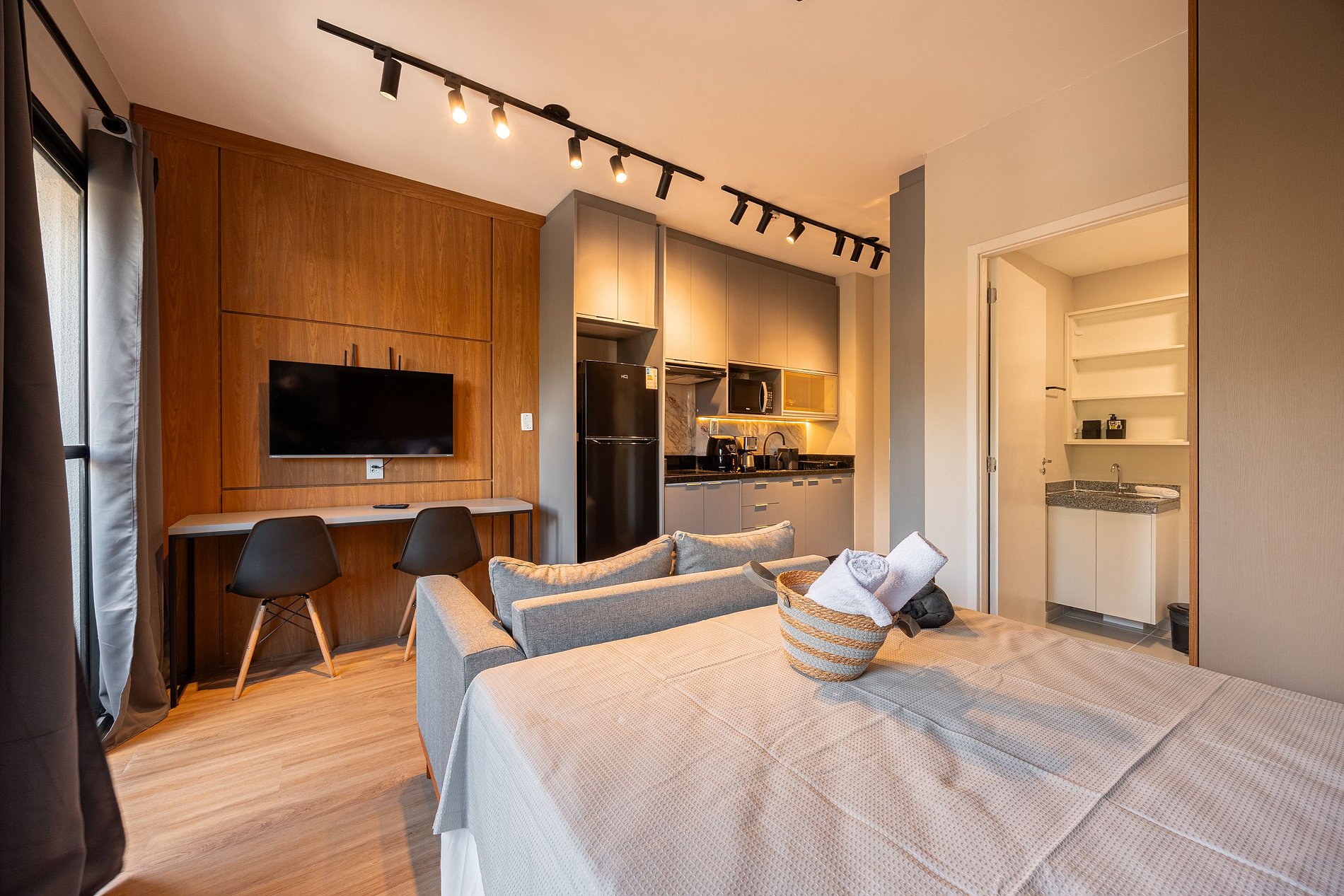 Estúdio moderno, bem distribuído e funcional, pensado para oferecer conforto e praticidade durante a estadia. O ambiente conta com boa iluminação natural, mobiliário adequado, cama confortável, cozinha funcional para o dia a dia e banheiro privativo. Ideal para quem busca comodidade, organização e uma estadia tranquila em São Paulo.