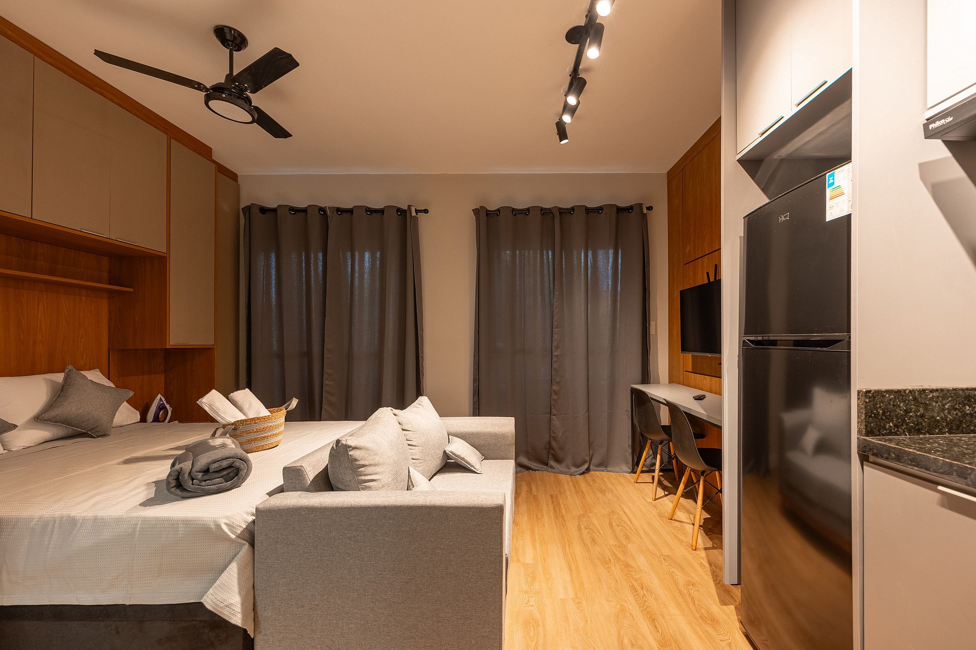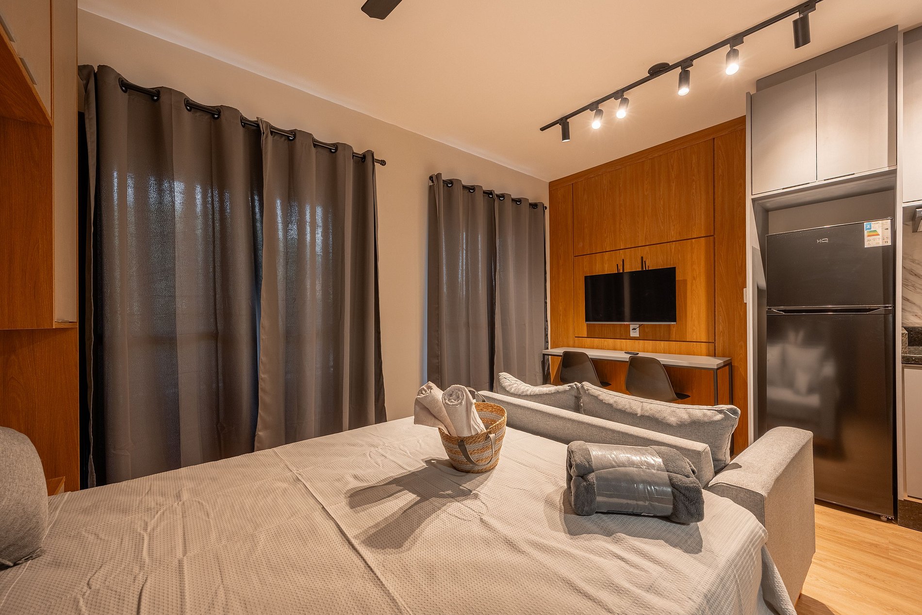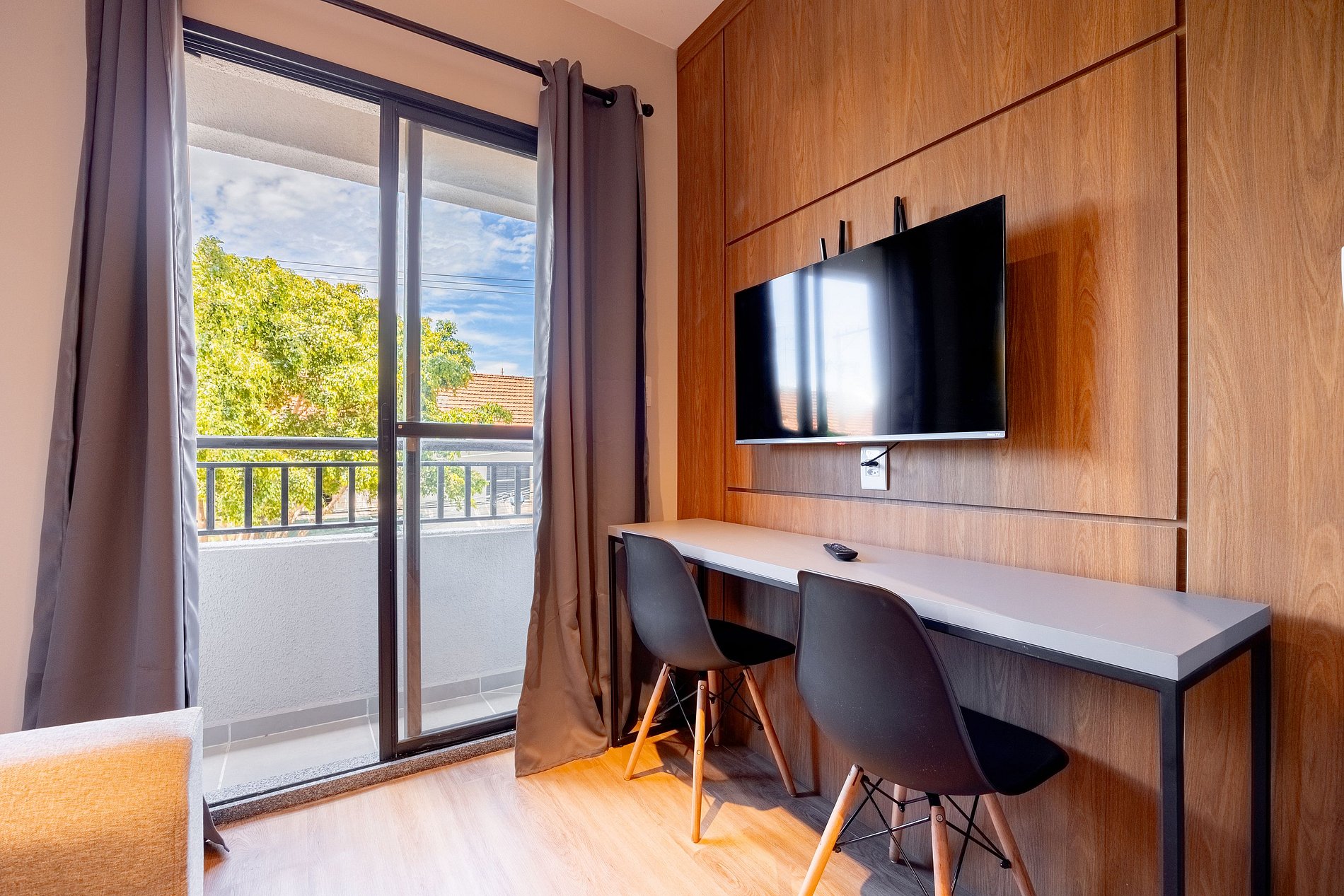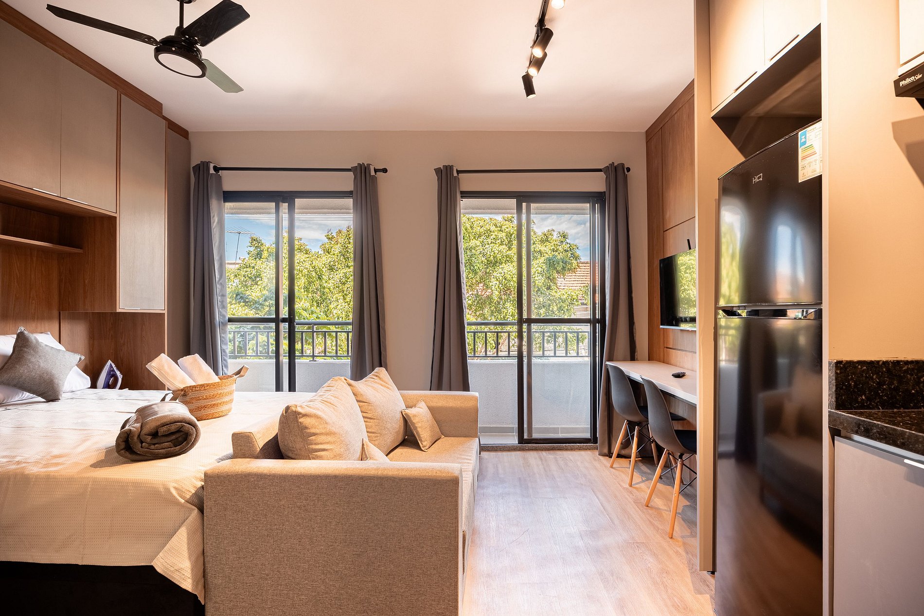 Estúdio moderno, bem distribuído e funcional, pensado para oferecer conforto e praticidade durante a estadia. O ambiente conta com boa iluminação natural, mobiliário adequado, cama confortável, cozinha funcional para o dia a dia e banheiro privativo. Ideal para quem busca comodidade, organização e uma estadia tranquila em São Paulo.