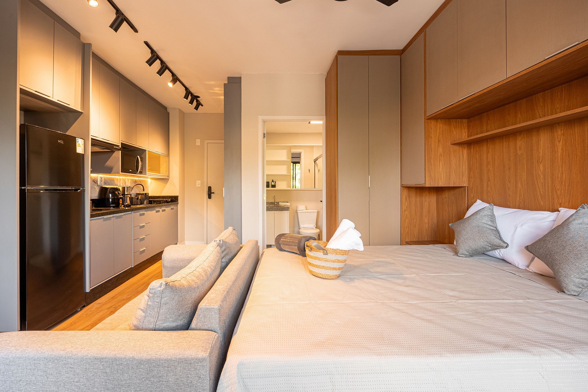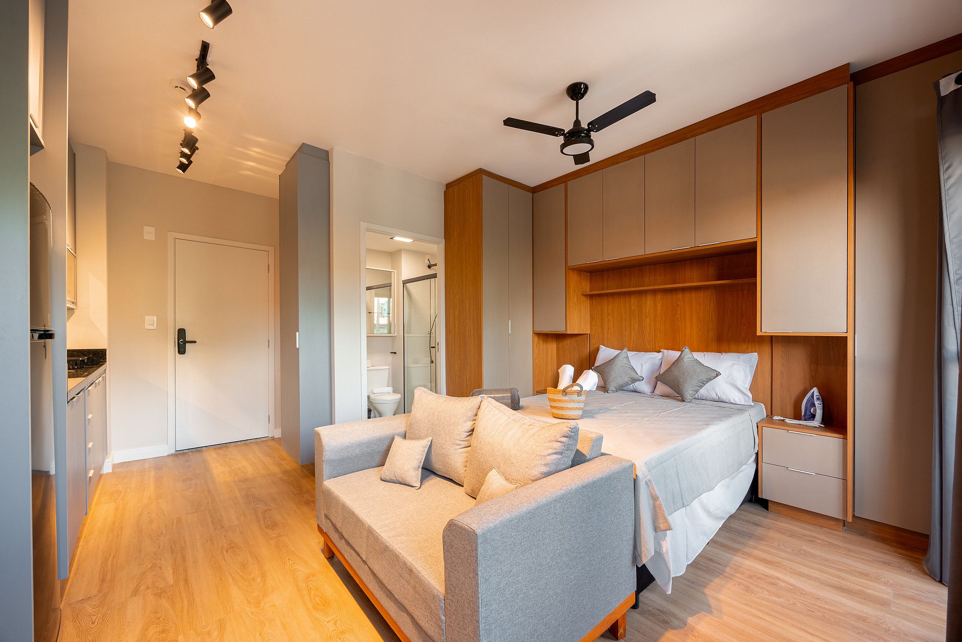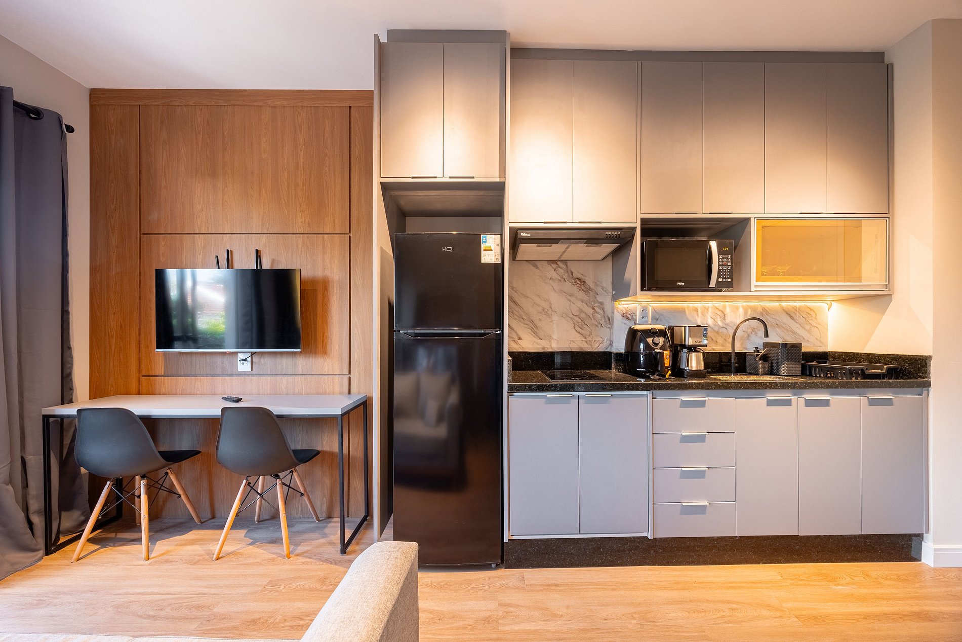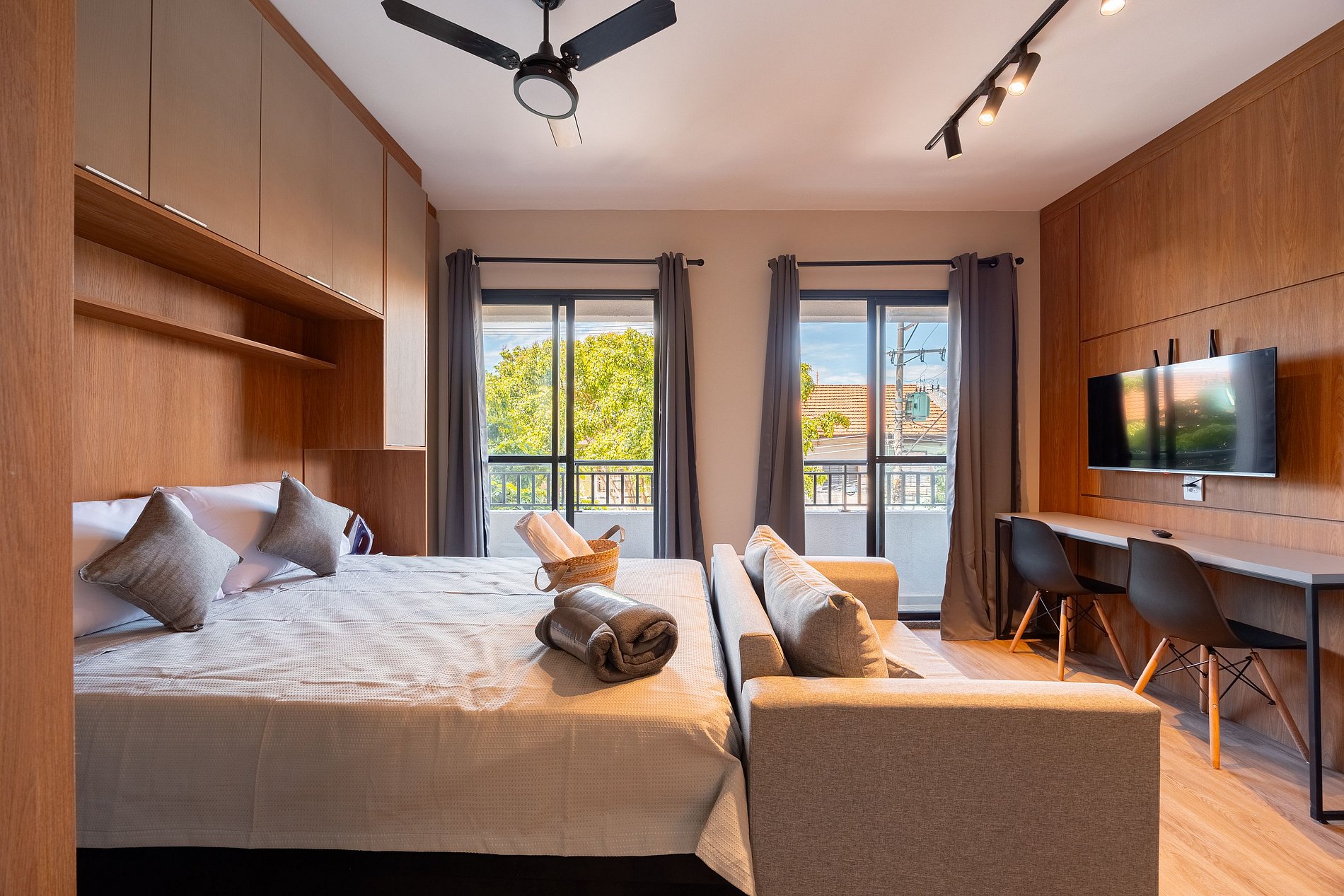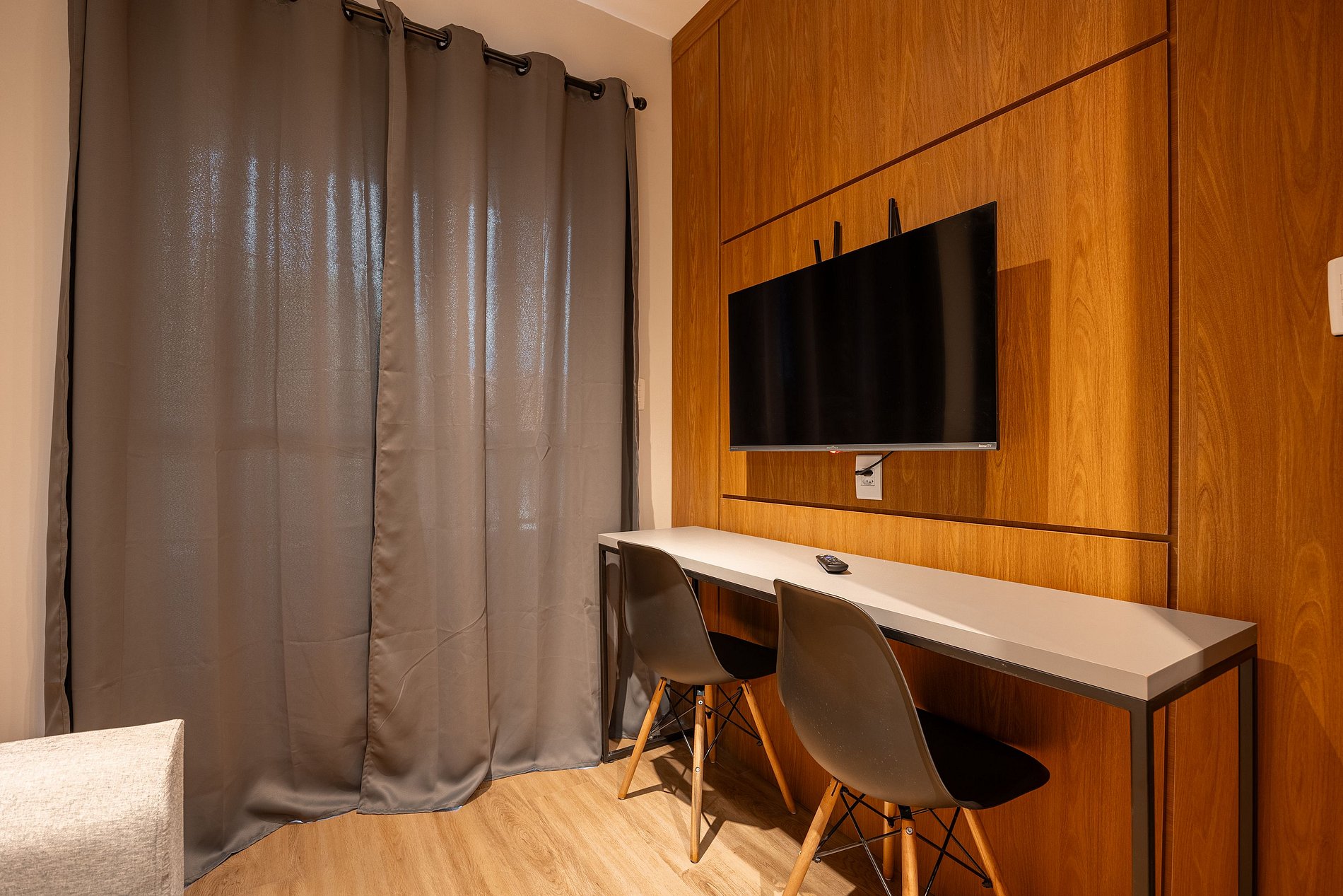 Estúdio moderno, bem distribuído e funcional, pensado para oferecer conforto e praticidade durante a estadia. O ambiente conta com boa iluminação natural, mobiliário adequado, cama confortável, cozinha funcional para o dia a dia e banheiro privativo. Ideal para quem busca comodidade, organização e uma estadia tranquila em São Paulo.