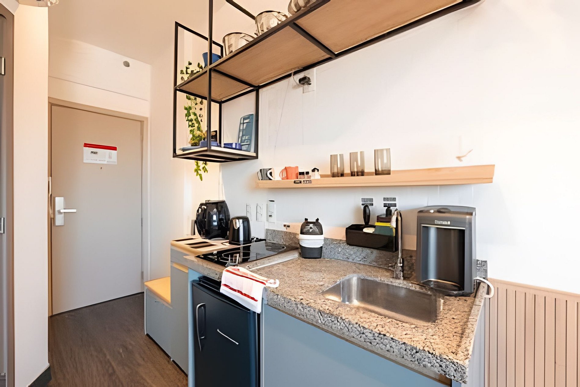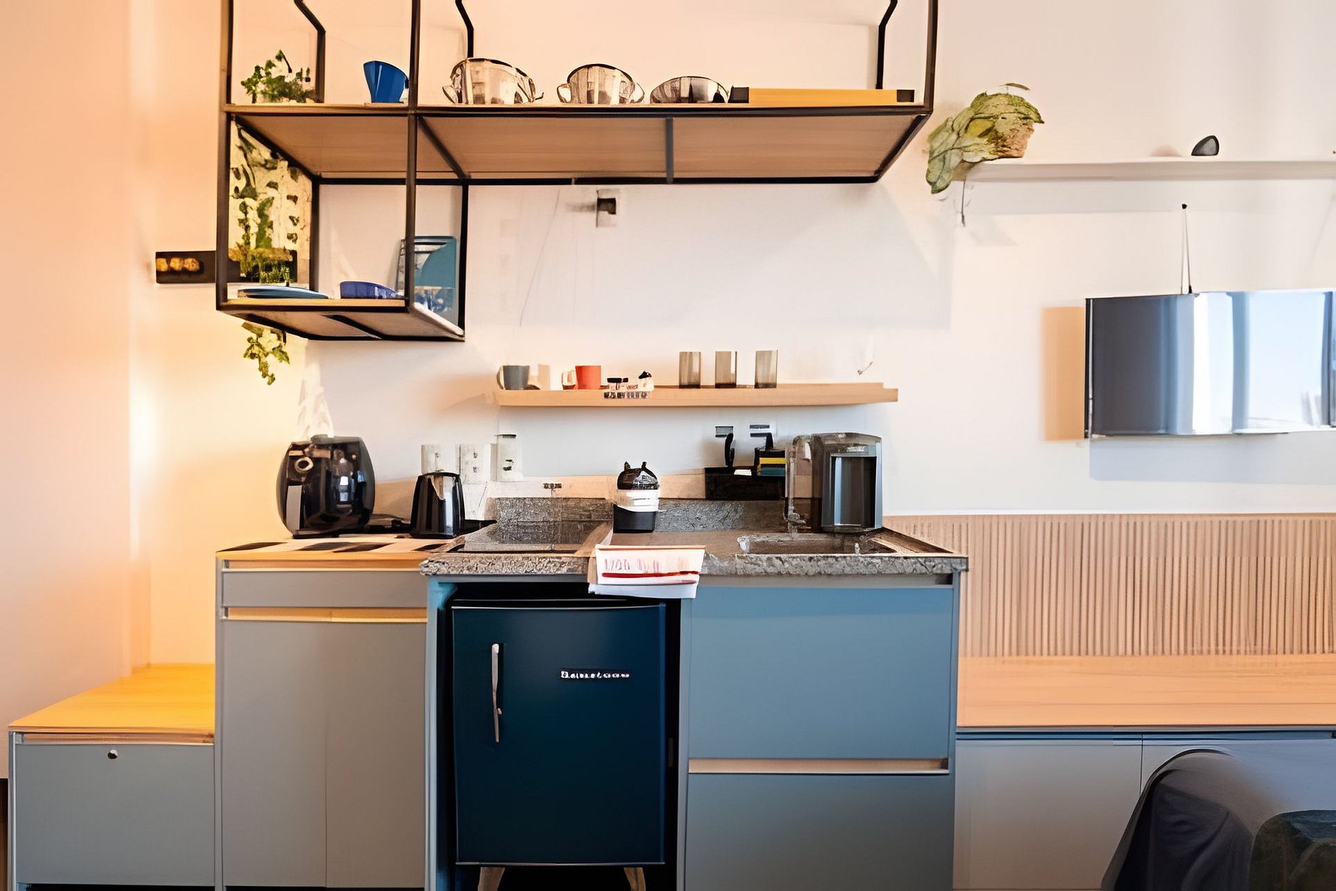 Estúdio no estilo suíte, totalmente equipado com estação de trabalho, closet, cabideiros, frigobar e diversas comodidades adicionais. A localização oferece fácil acesso a uma grande variedade de opções comerciais nas proximidades, além de contar com uma lavanderia self-service no próprio condomínio, a preços acessíveis. Um ambiente ideal para quem precisa de praticidade e conforto para trabalhar em home office.