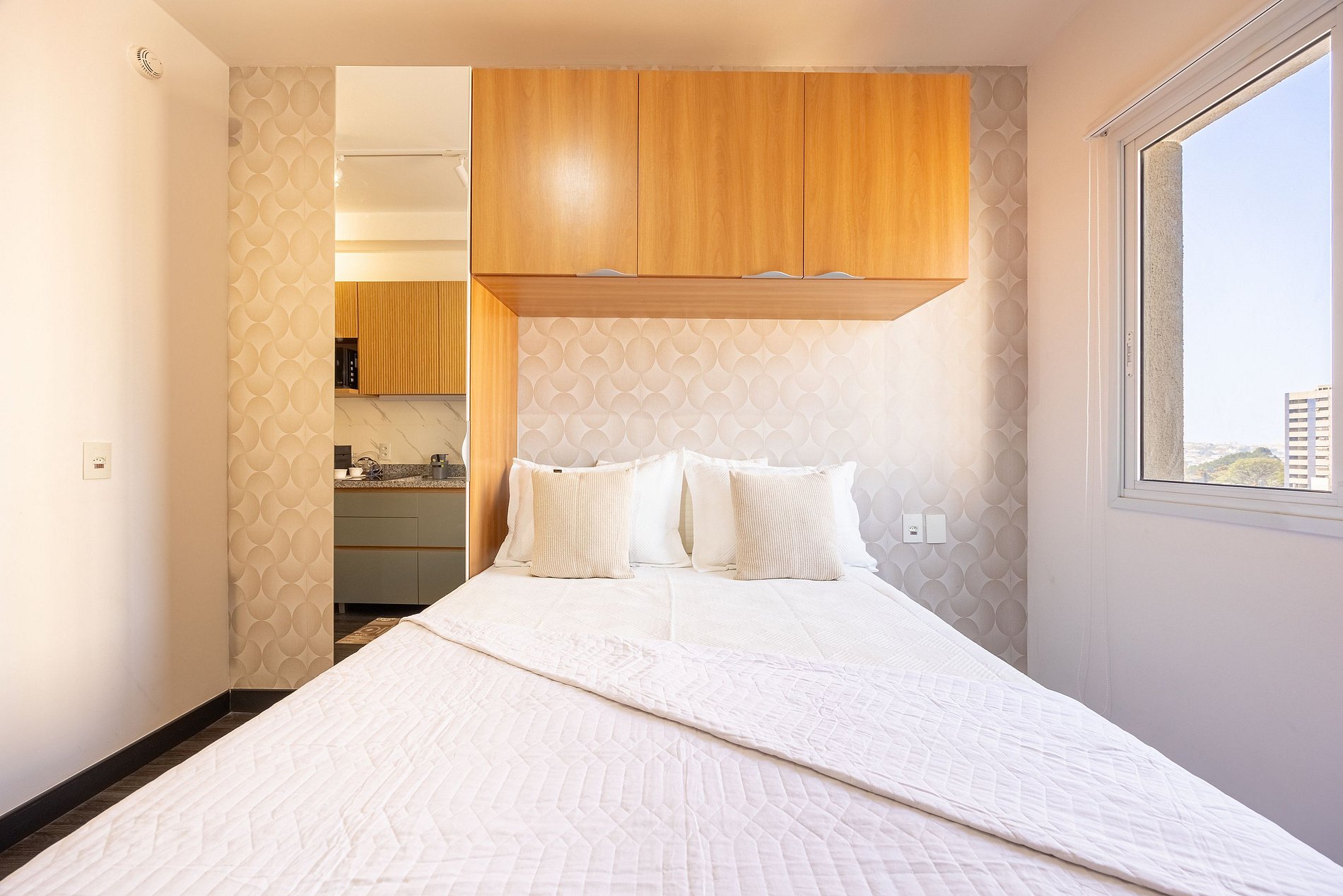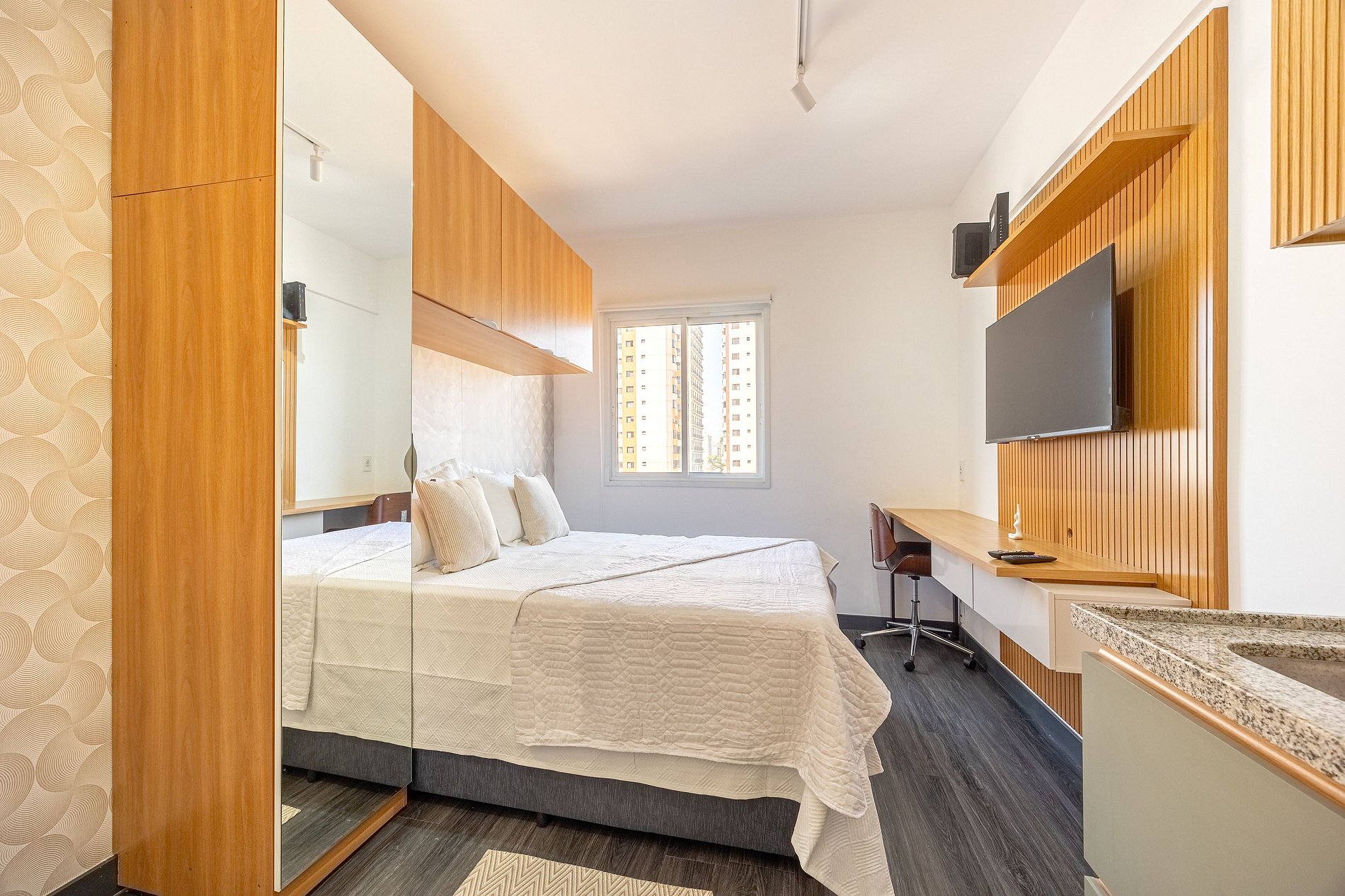 Estudio do tipo suíte, possui estação de trabalho, closet, cabideiros, frigobar entre outras comodidades . A regiao oferece uma variedade de comercio nas proximidades, lavanderia Self service no condomínio (por um custo acessível). Um excelente local para trabalhar home office ou curtir um lazer