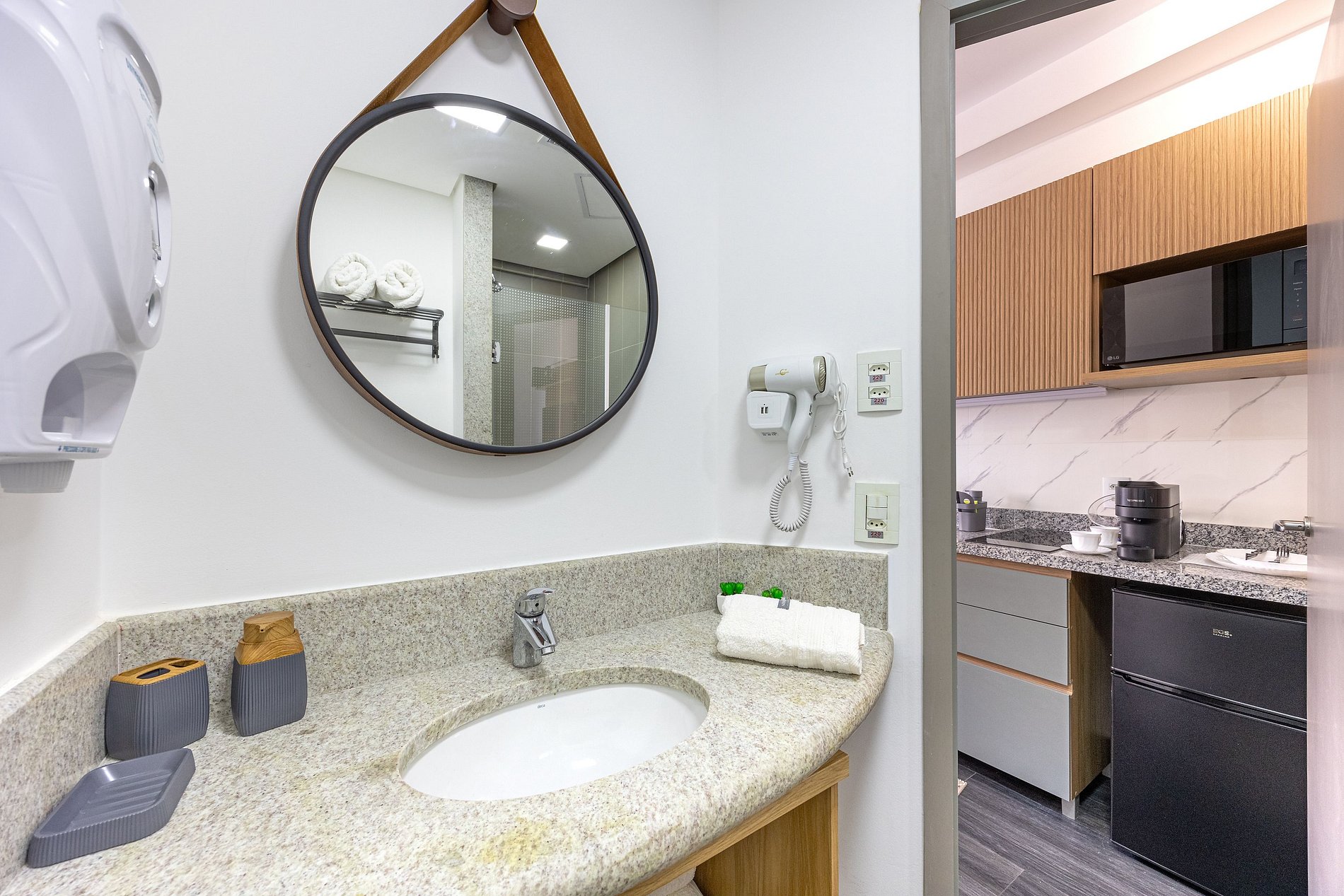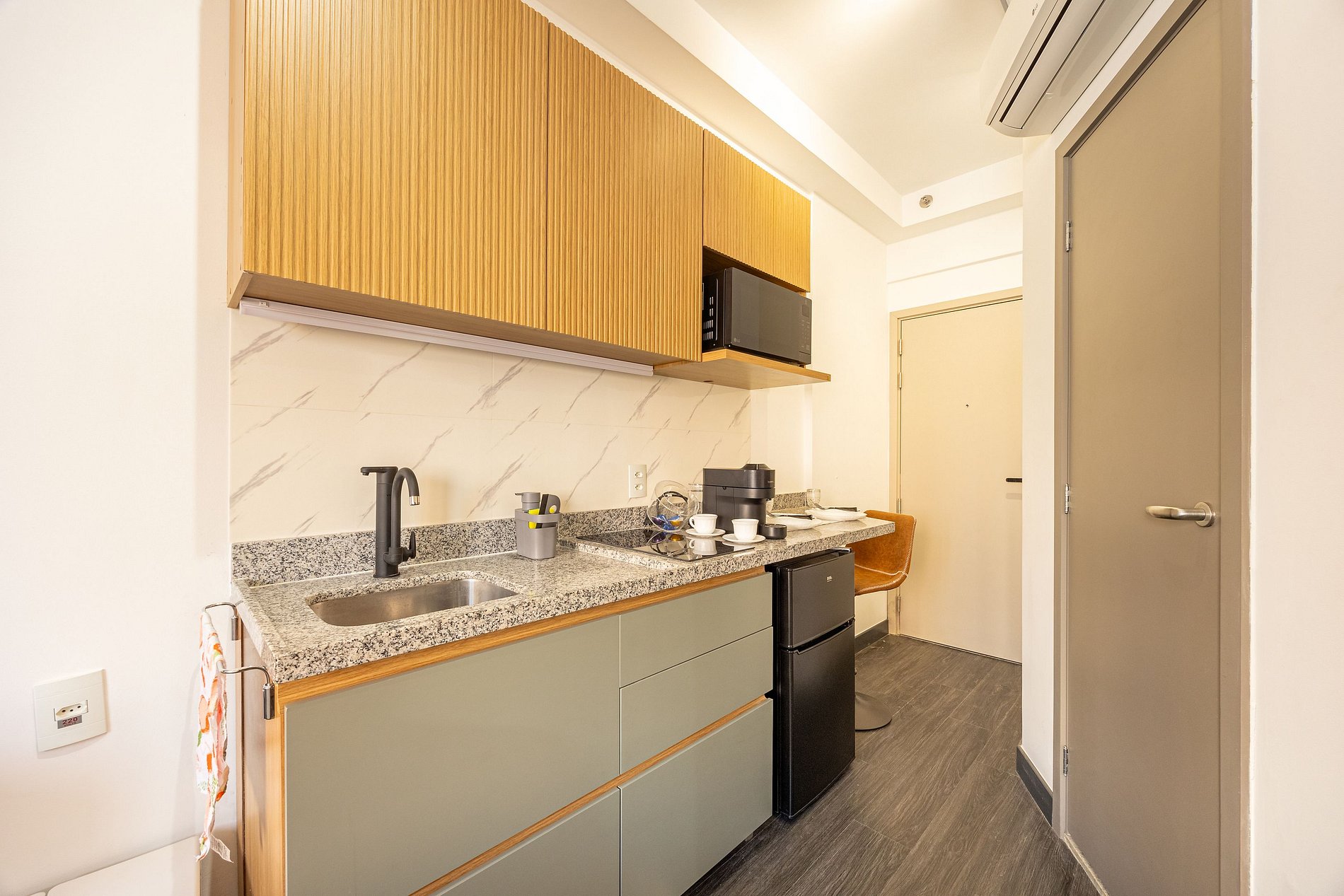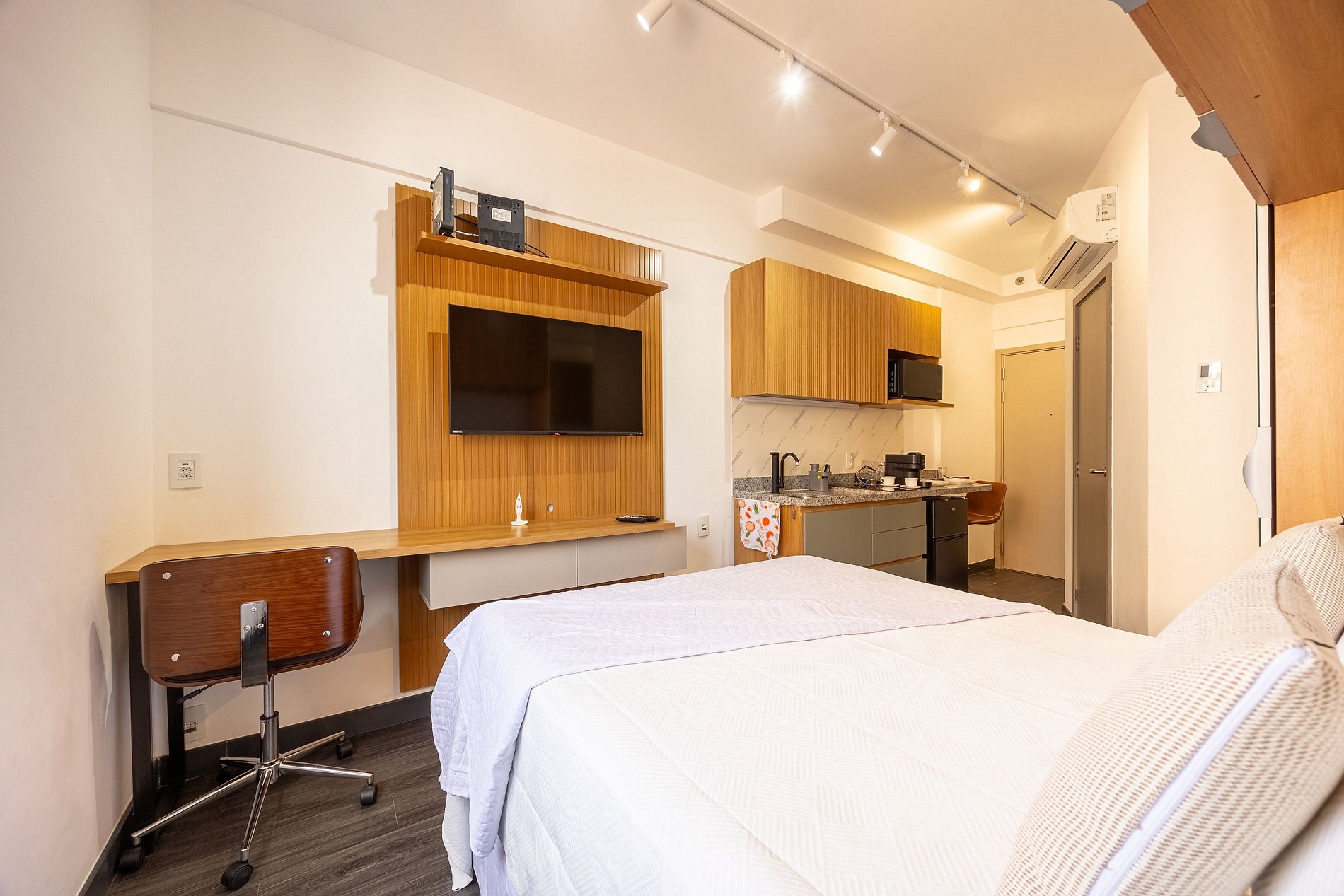 Estudio do tipo suíte, possui estação de trabalho, closet, cabideiros, frigobar entre outras comodidades . A regiao oferece uma variedade de comercio nas proximidades, lavanderia Self service no condomínio (por um custo acessível). Um excelente local para trabalhar home office ou curtir um lazer