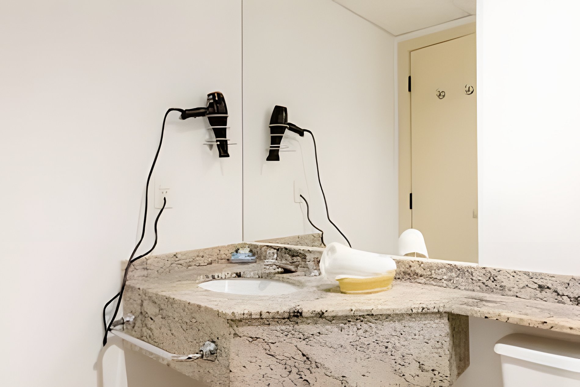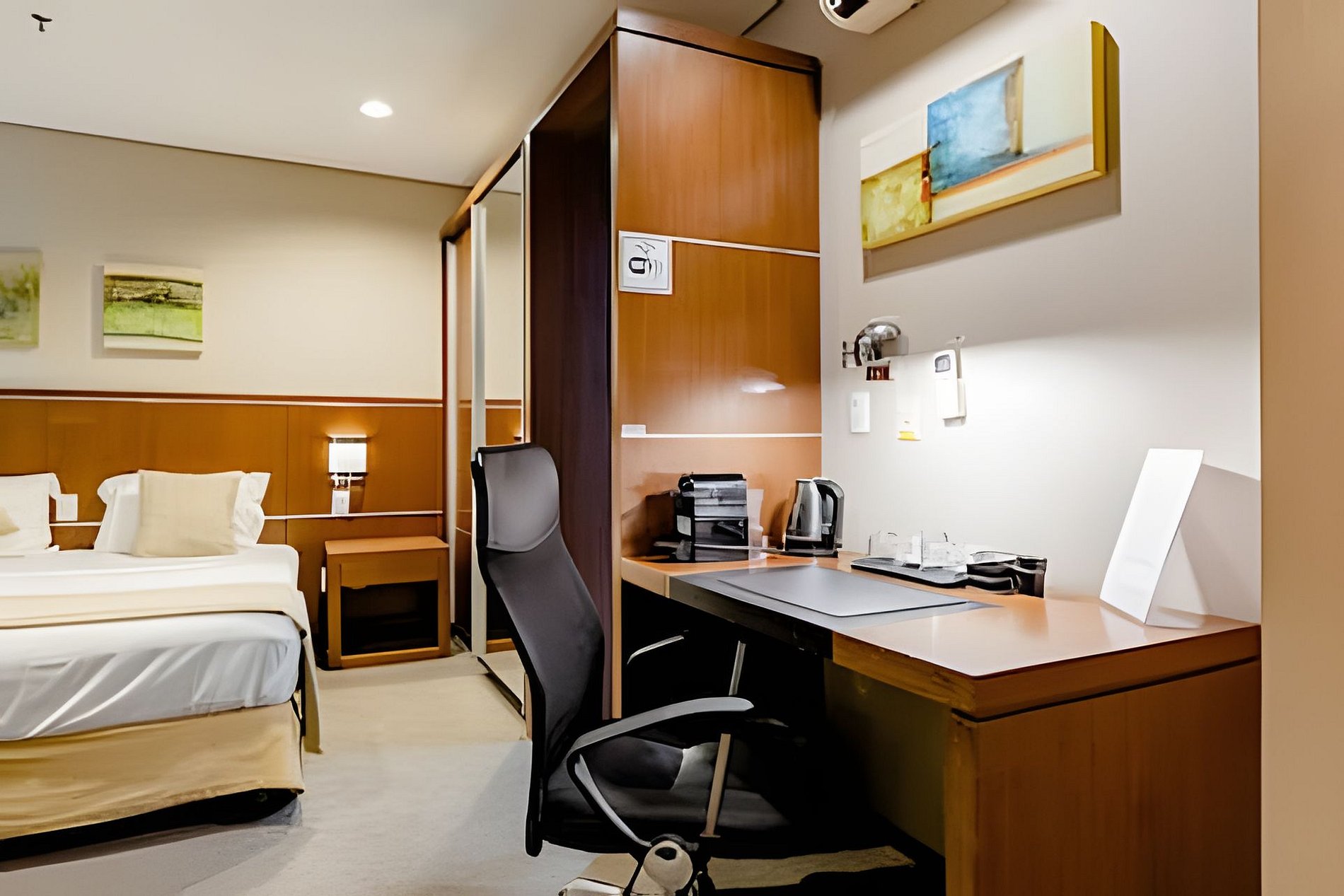 Flat do tipo suíte, possui estação de trabalho, closet, cabideiros, frigobar entre outras comodidades. O condomínio oferece ainda: restaurante, cafeteria, farmácia, mercado atravessando a rua, Lavanderia Self service no condomínio (com custo acessível). Um excelente local para trabalhar home office ou curtir um lazer.