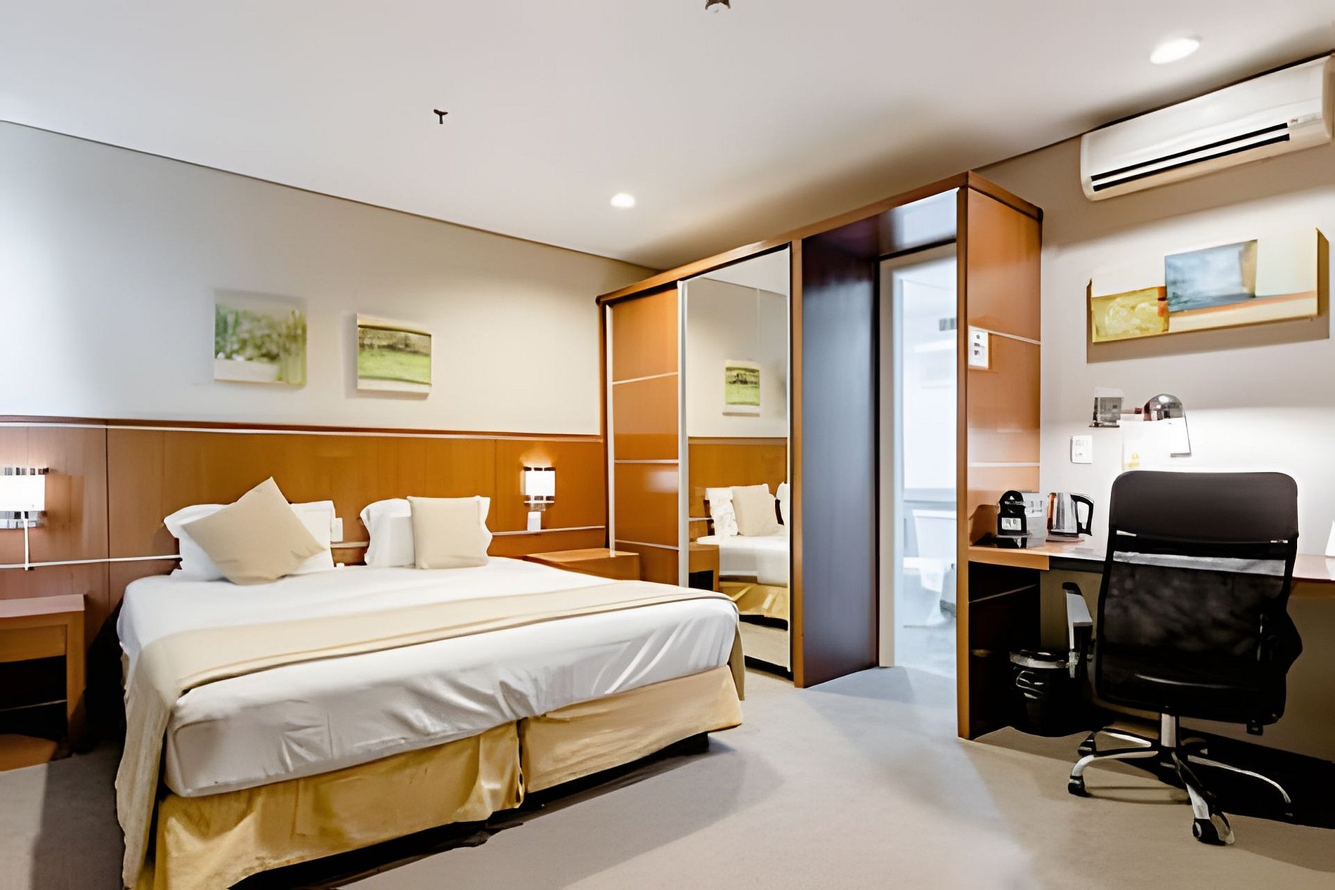 Flat do tipo suíte, possui estação de trabalho, closet, cabideiros, frigobar entre outras comodidades. O condomínio oferece ainda: restaurante, cafeteria, farmácia, mercado atravessando a rua, Lavanderia Self service no condomínio (com custo acessível). Um excelente local para trabalhar home office ou curtir um lazer.