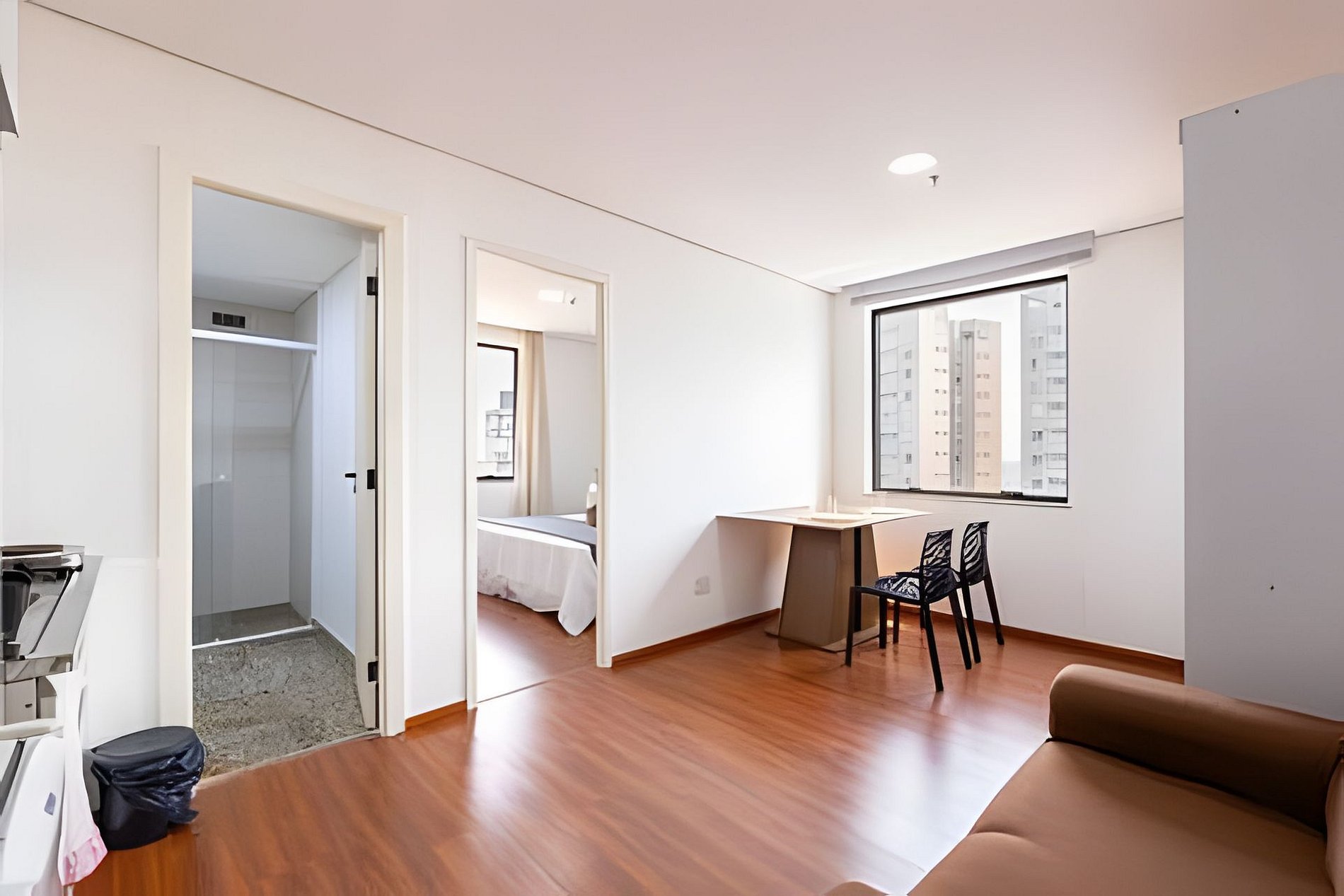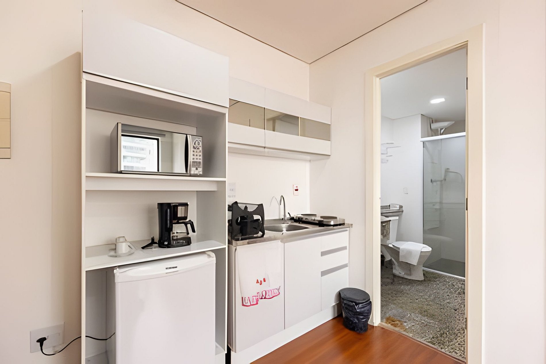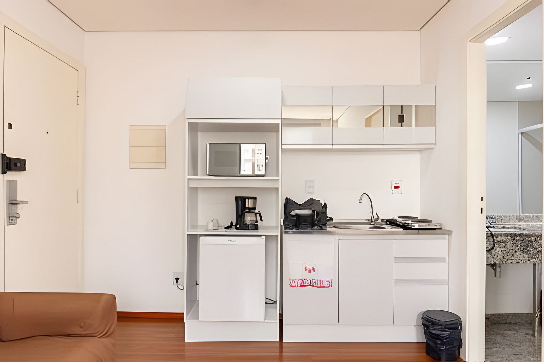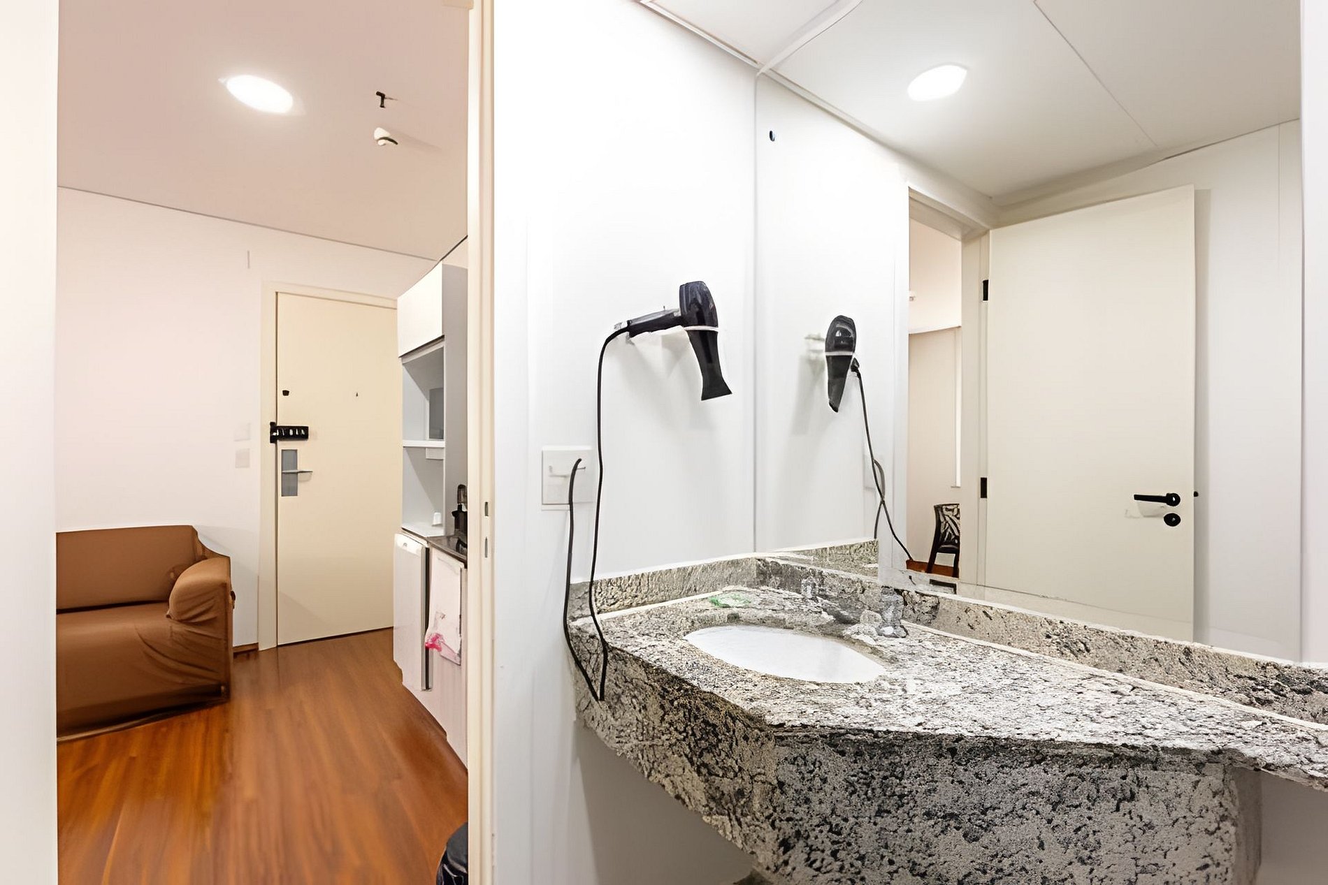Flat do tipo suíte, possui, closet, cabideiros, cozinha, frigobar entre outras comodidades . O condomínio oferece ainda: restaurante, cafeteria, farmácia, mercado atravessando a rua, Lavanderia Self service no condomínio (com custo acessível).Um excelente local para trabalhar home office ou curtir um lazer.