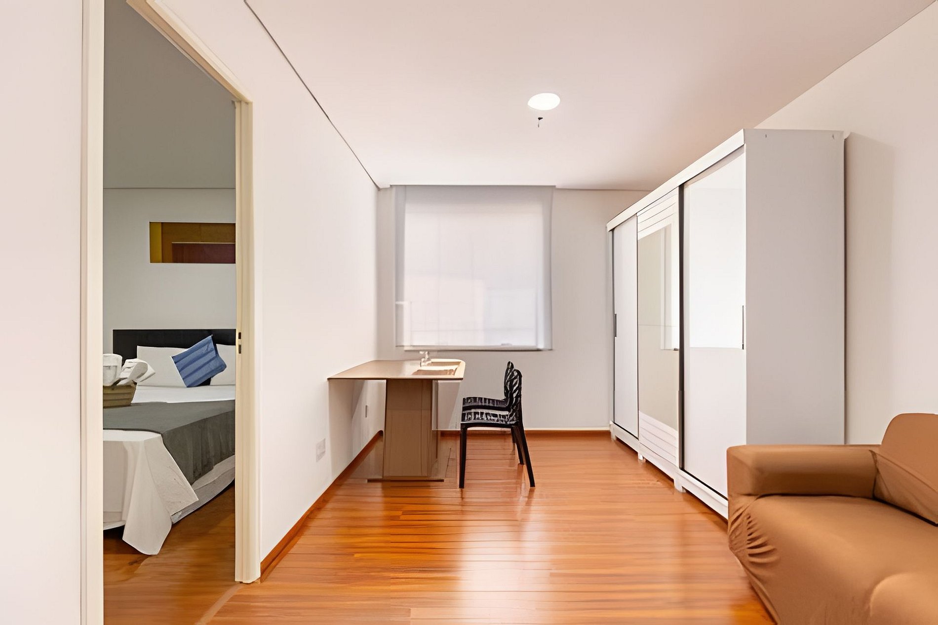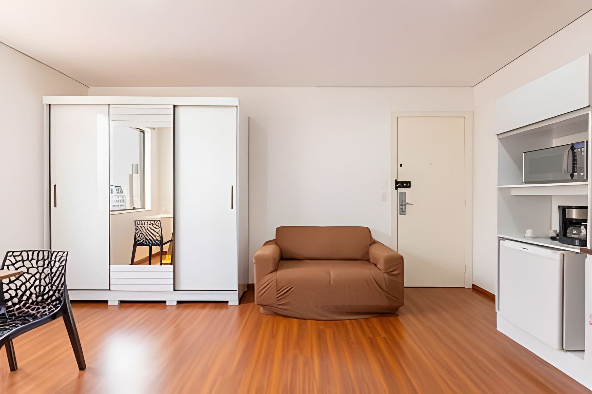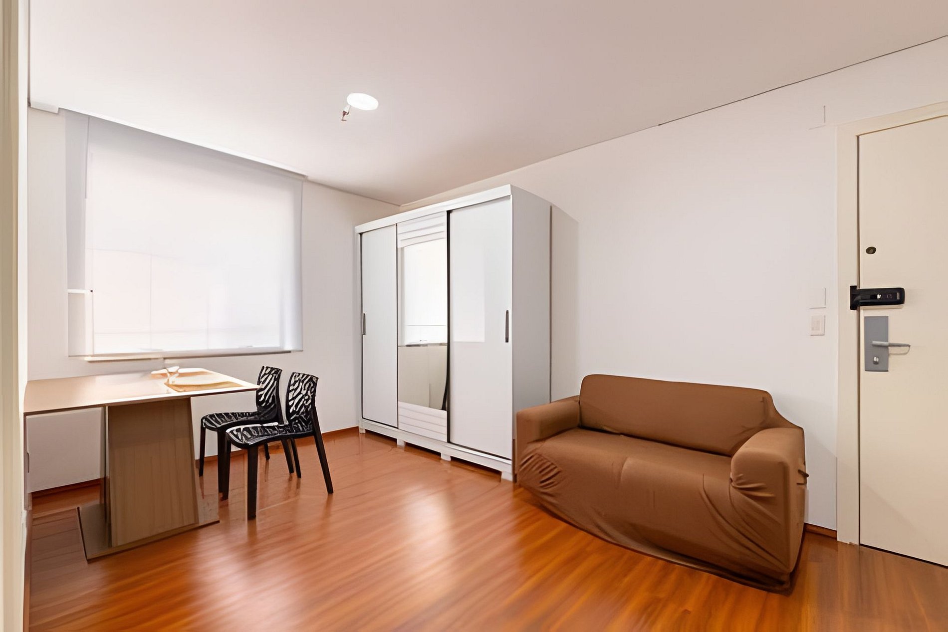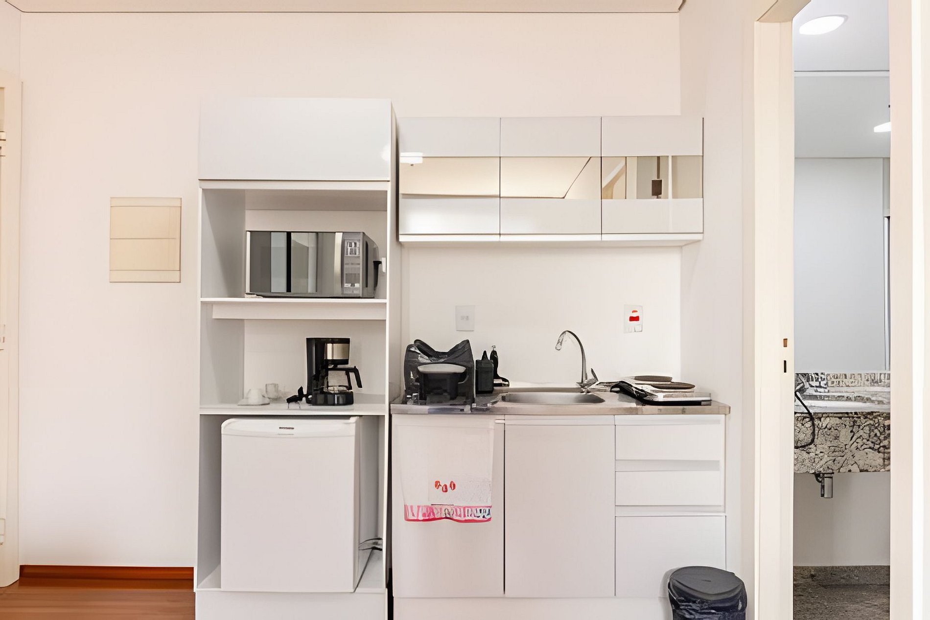 Flat do tipo suíte, possui, closet, cabideiros, cozinha, frigobar entre outras comodidades . O condomínio oferece ainda: restaurante, cafeteria, farmácia, mercado atravessando a rua, Lavanderia Self service no condomínio (com custo acessível).Um excelente local para trabalhar home office ou curtir um lazer.