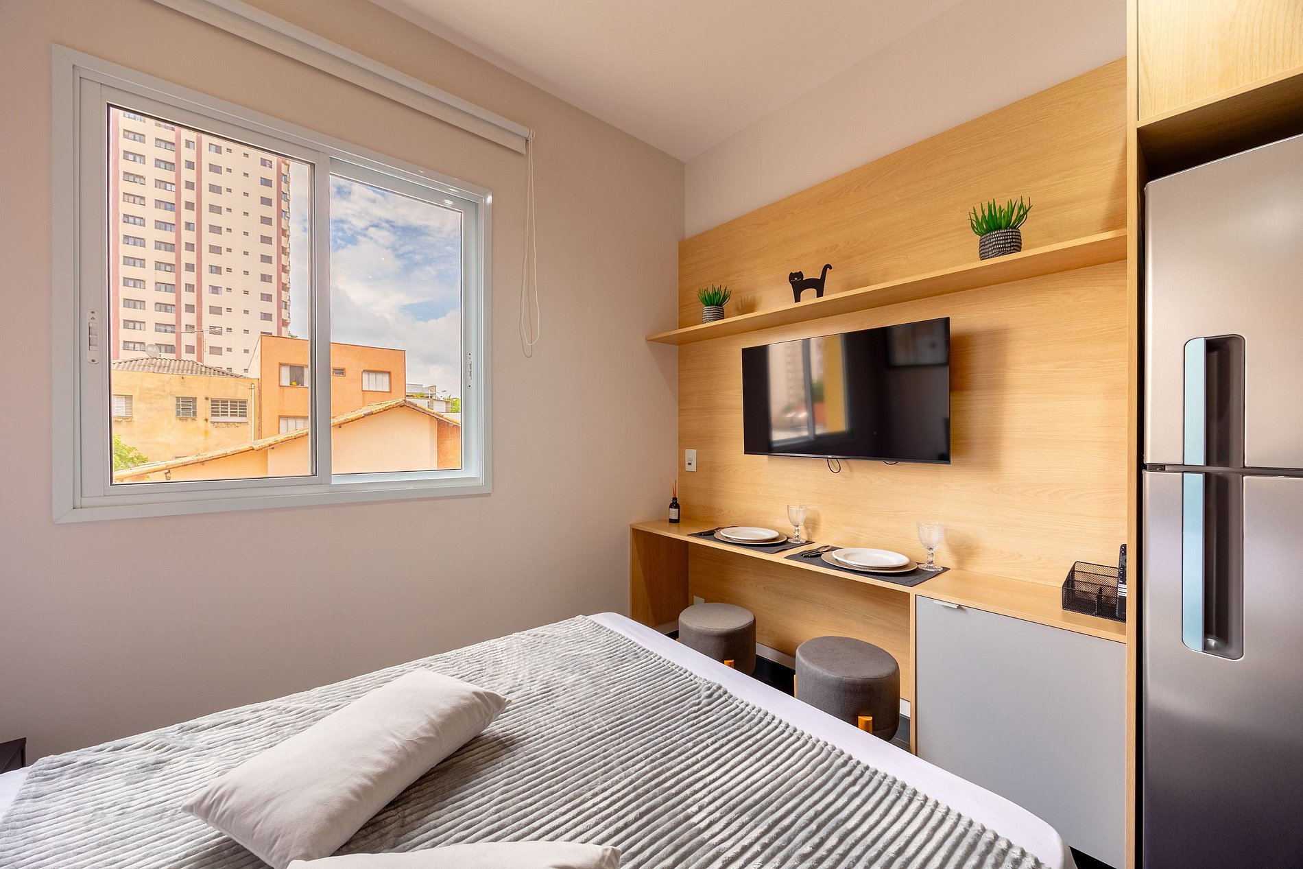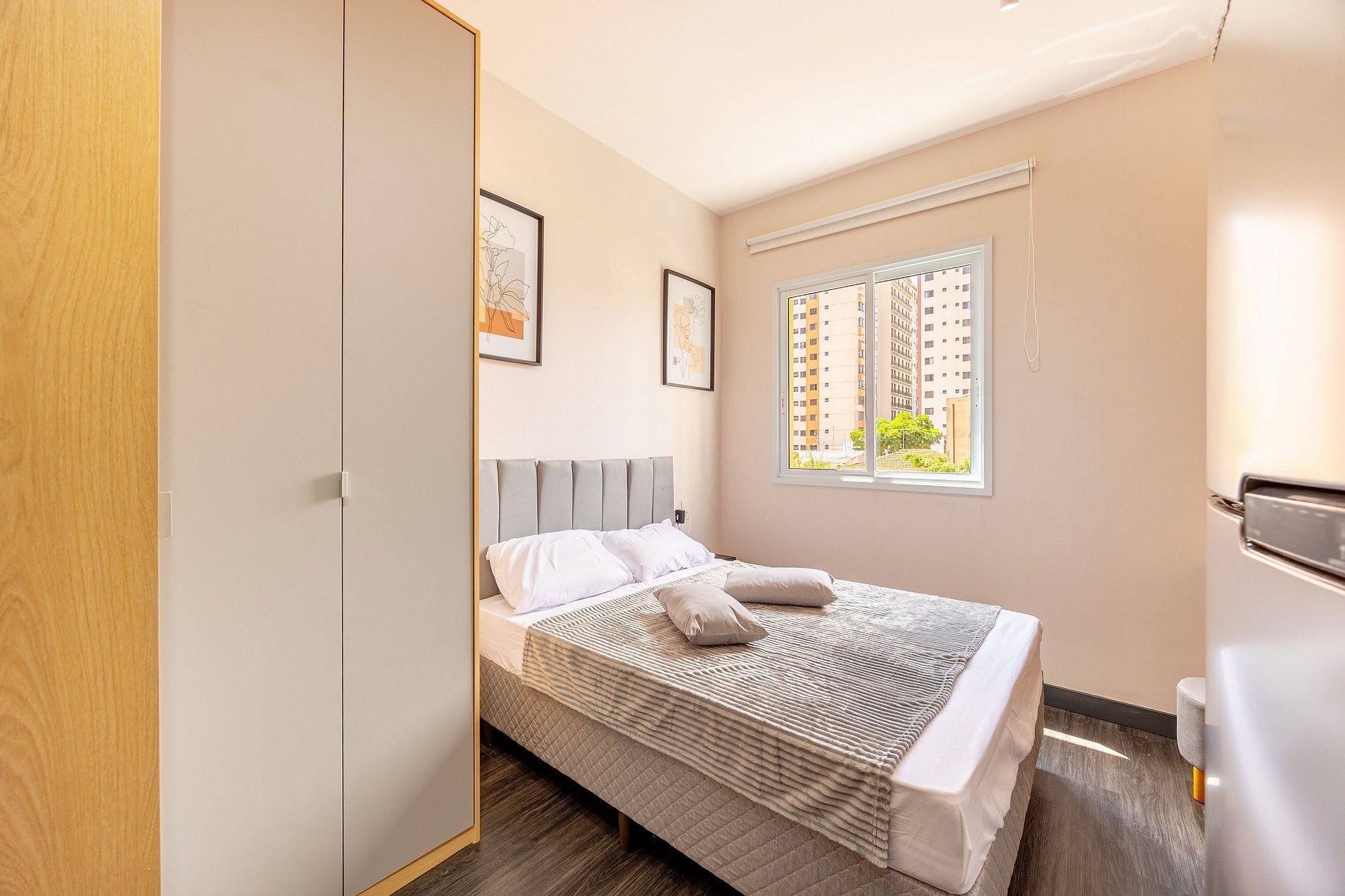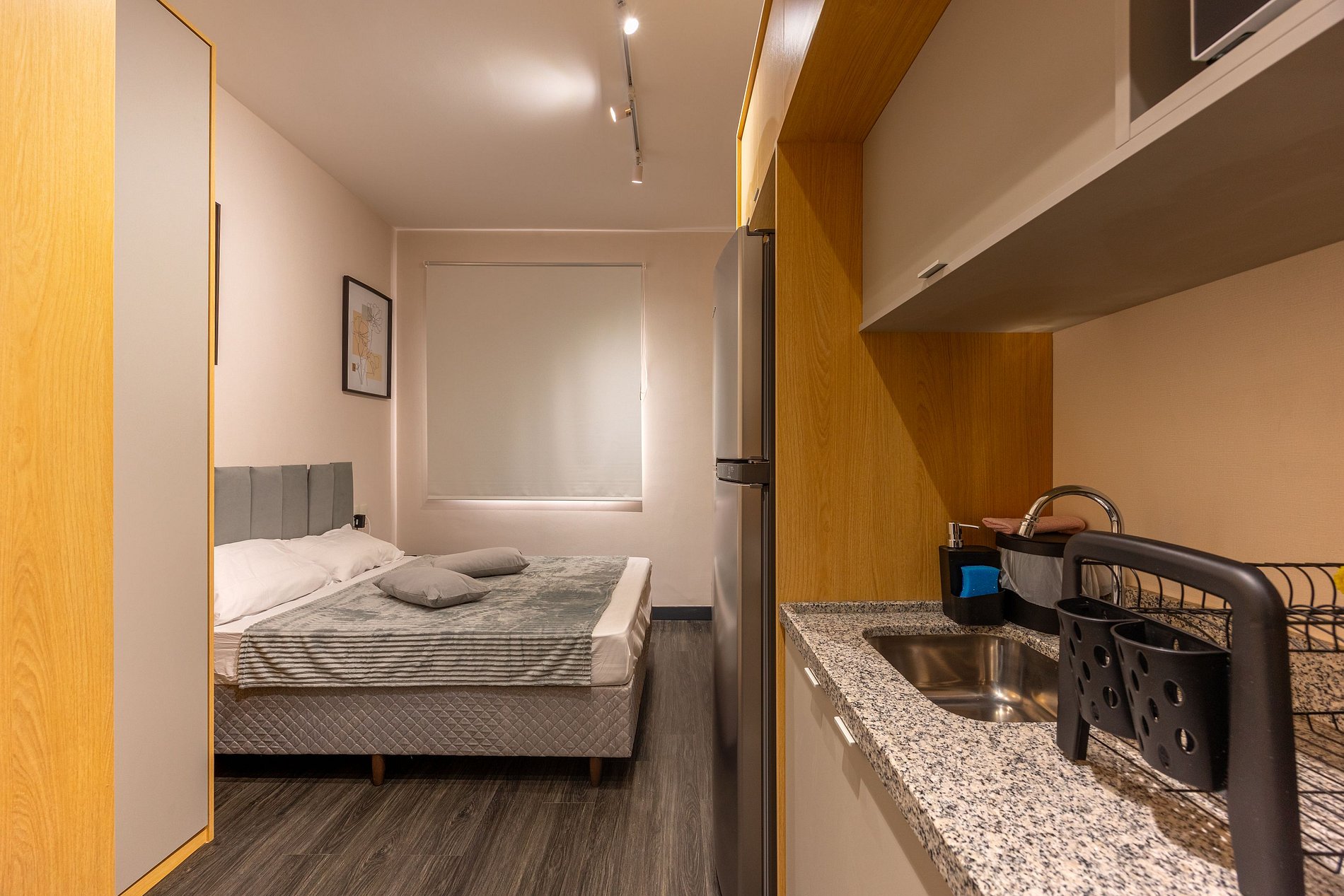 Estúdio estilo suíte, moderno e funcional, perfeito para quem busca conforto e praticidade. O espaço conta com closet, cabideiros, geladeira e diversas outras comodidades que garantem uma estadia agradável e eficiente. Ideal para estadias curtas ou longas, o ambiente foi pensado para oferecer bem-estar e organização no dia a dia.