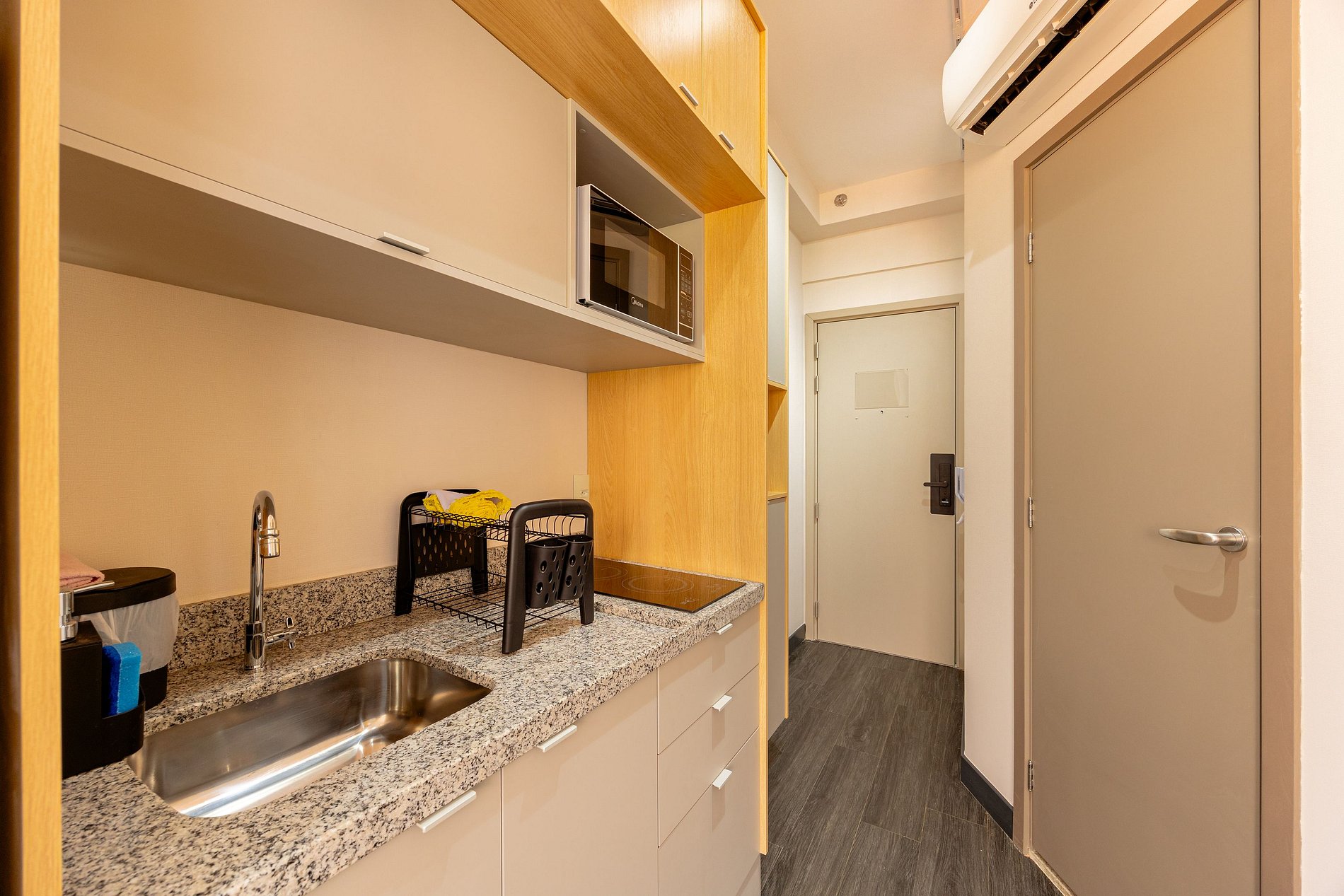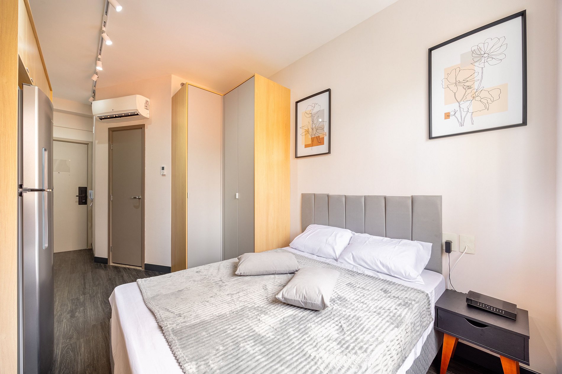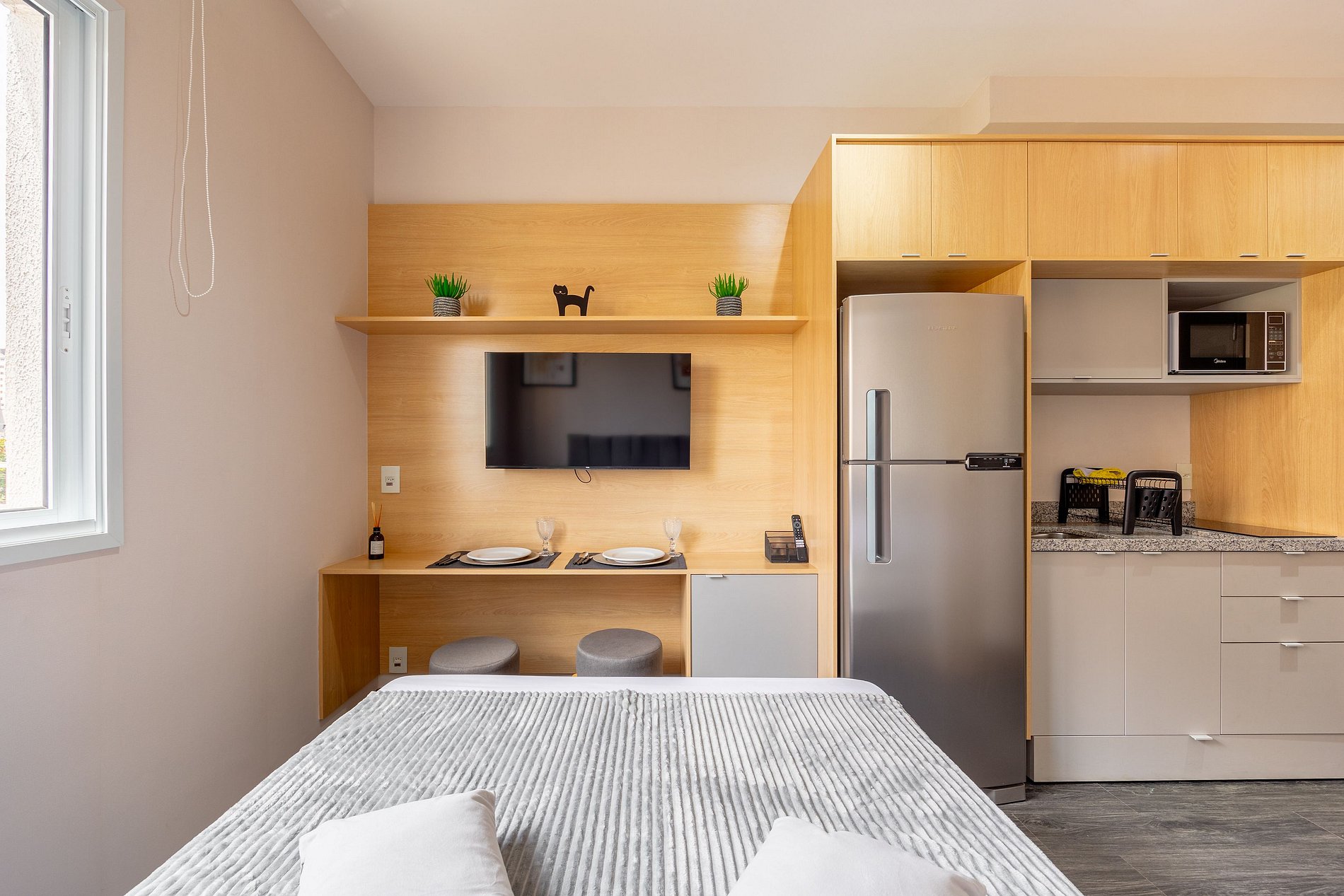 Estúdio estilo suíte, moderno e funcional, perfeito para quem busca conforto e praticidade. O espaço conta com closet, cabideiros, geladeira e diversas outras comodidades que garantem uma estadia agradável e eficiente. Ideal para estadias curtas ou longas, o ambiente foi pensado para oferecer bem-estar e organização no dia a dia.