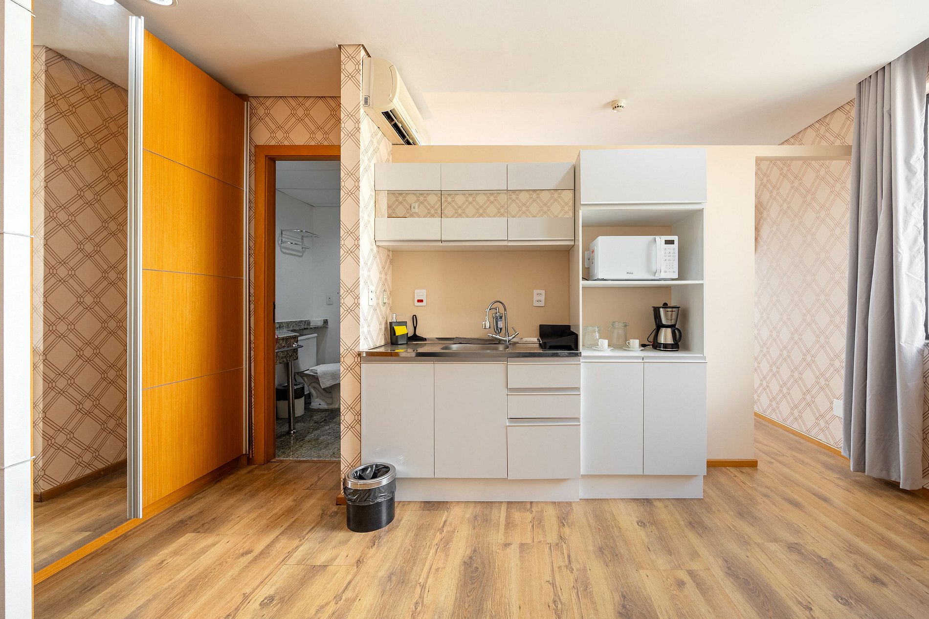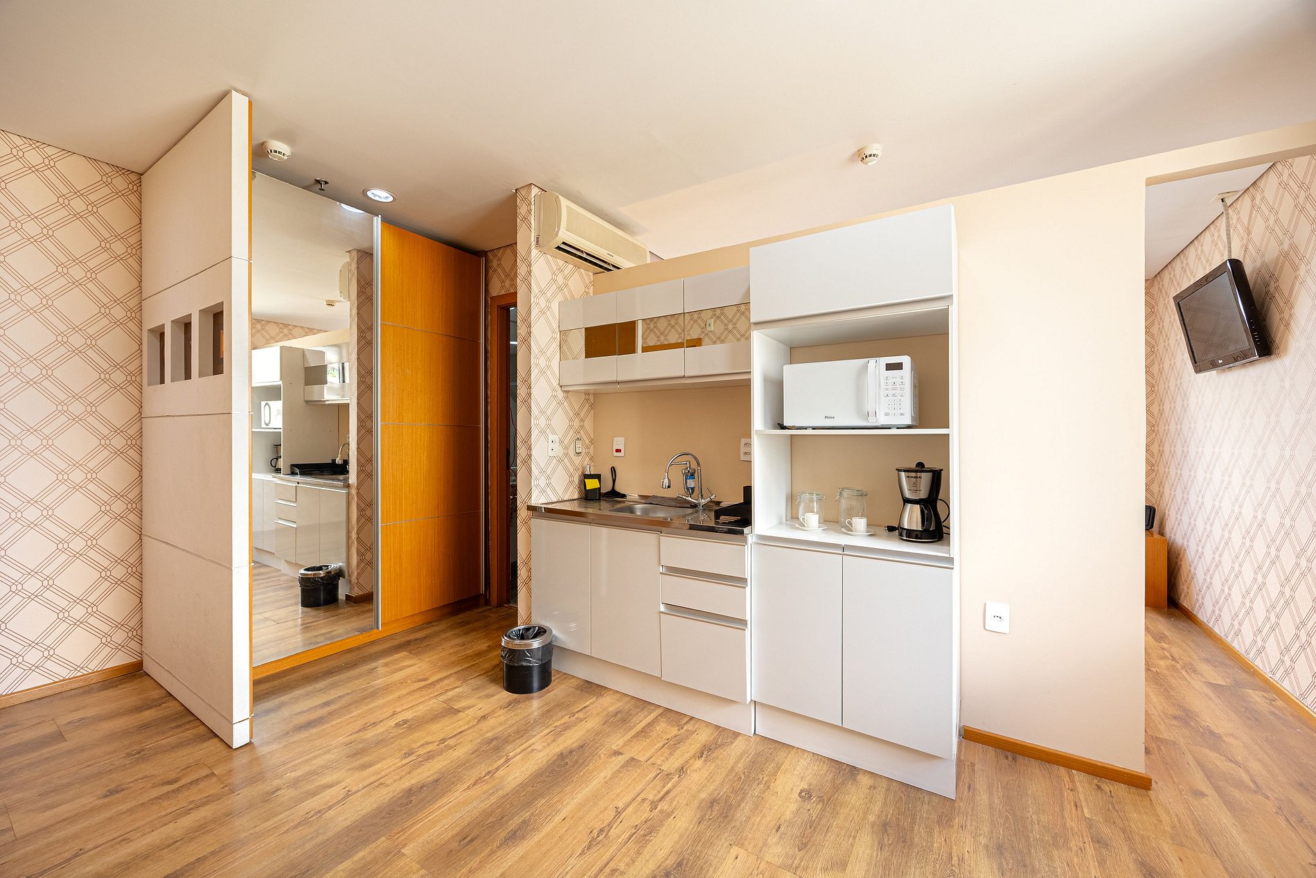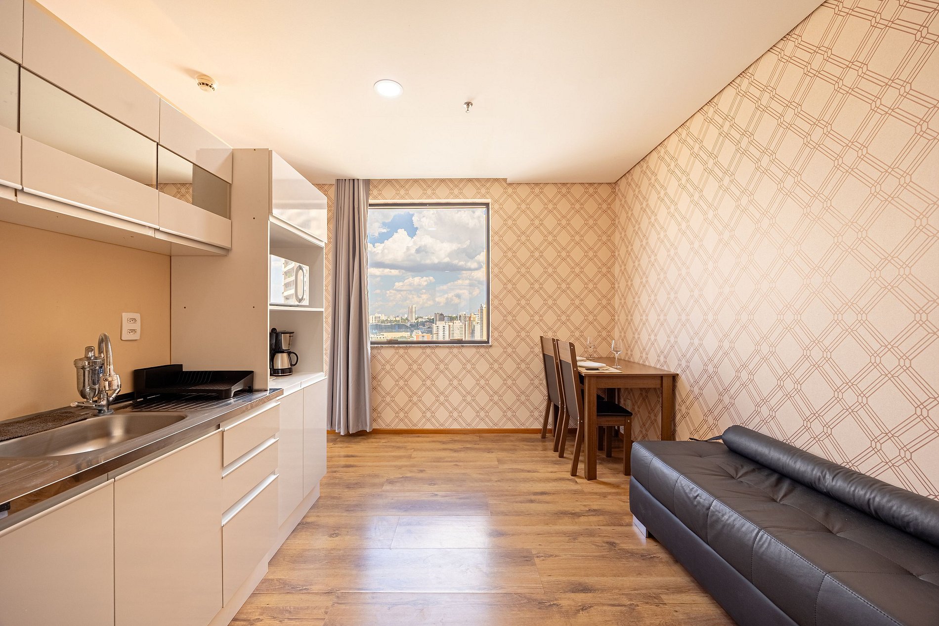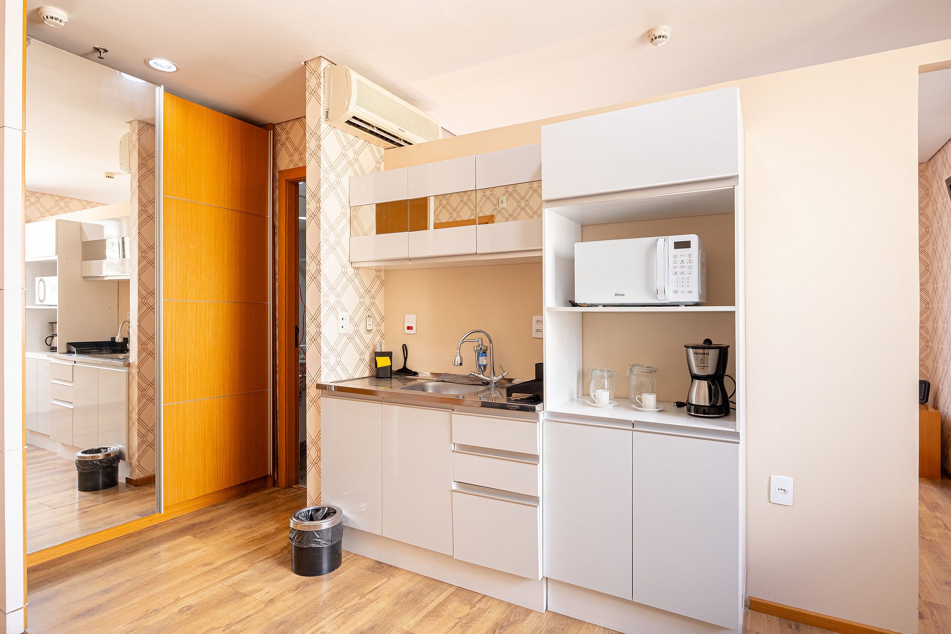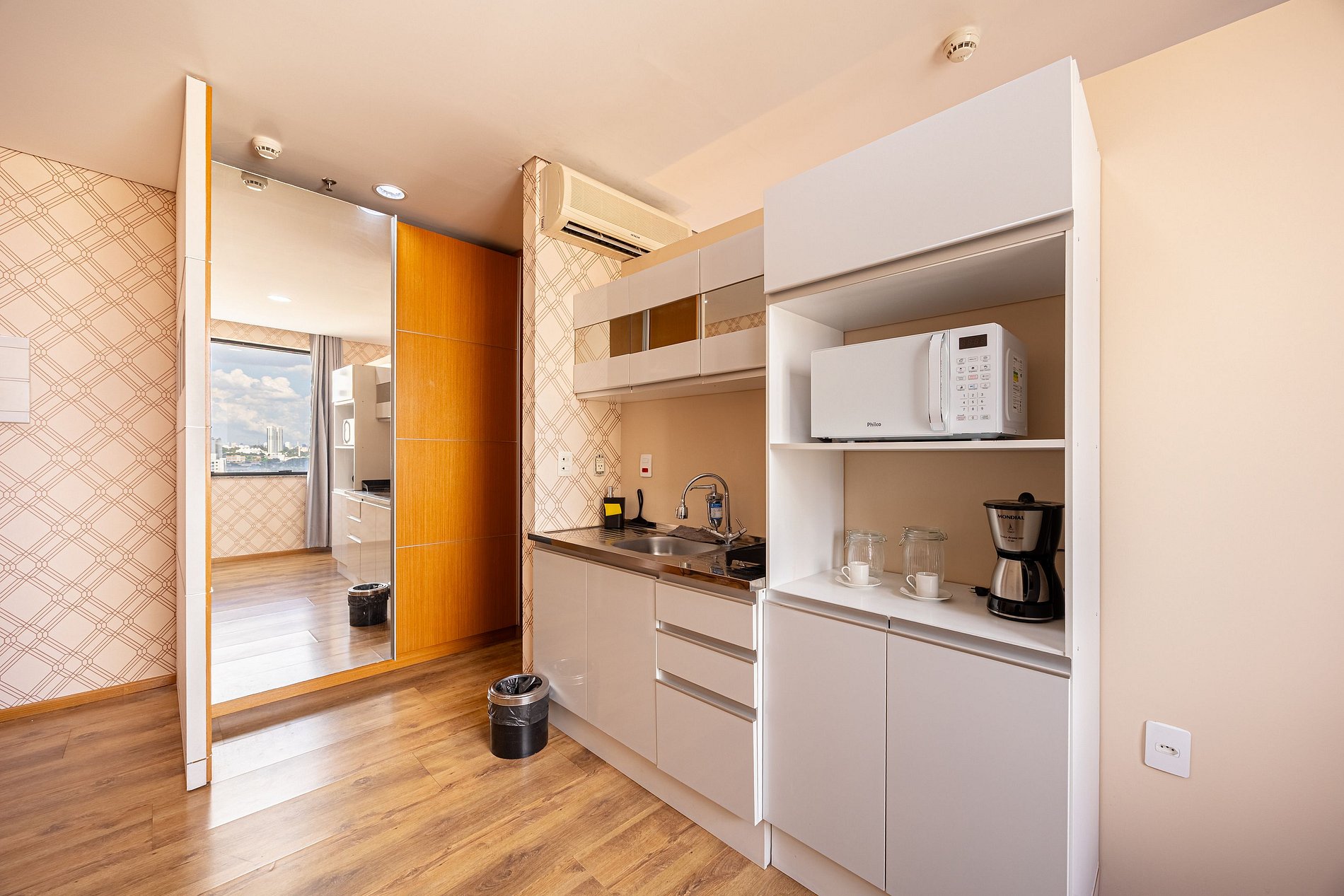 Flat do tipo suíte, possui closet, cabideiros, frigobar entre outras comodidades. O condomínio oferece ainda: restaurante, cafeteria, farmácia, mercado atravessando a rua, lavanderia Self-service no condomínio (com custo acessível). Um excelente local para trabalhar home office ou curtir um lazer.