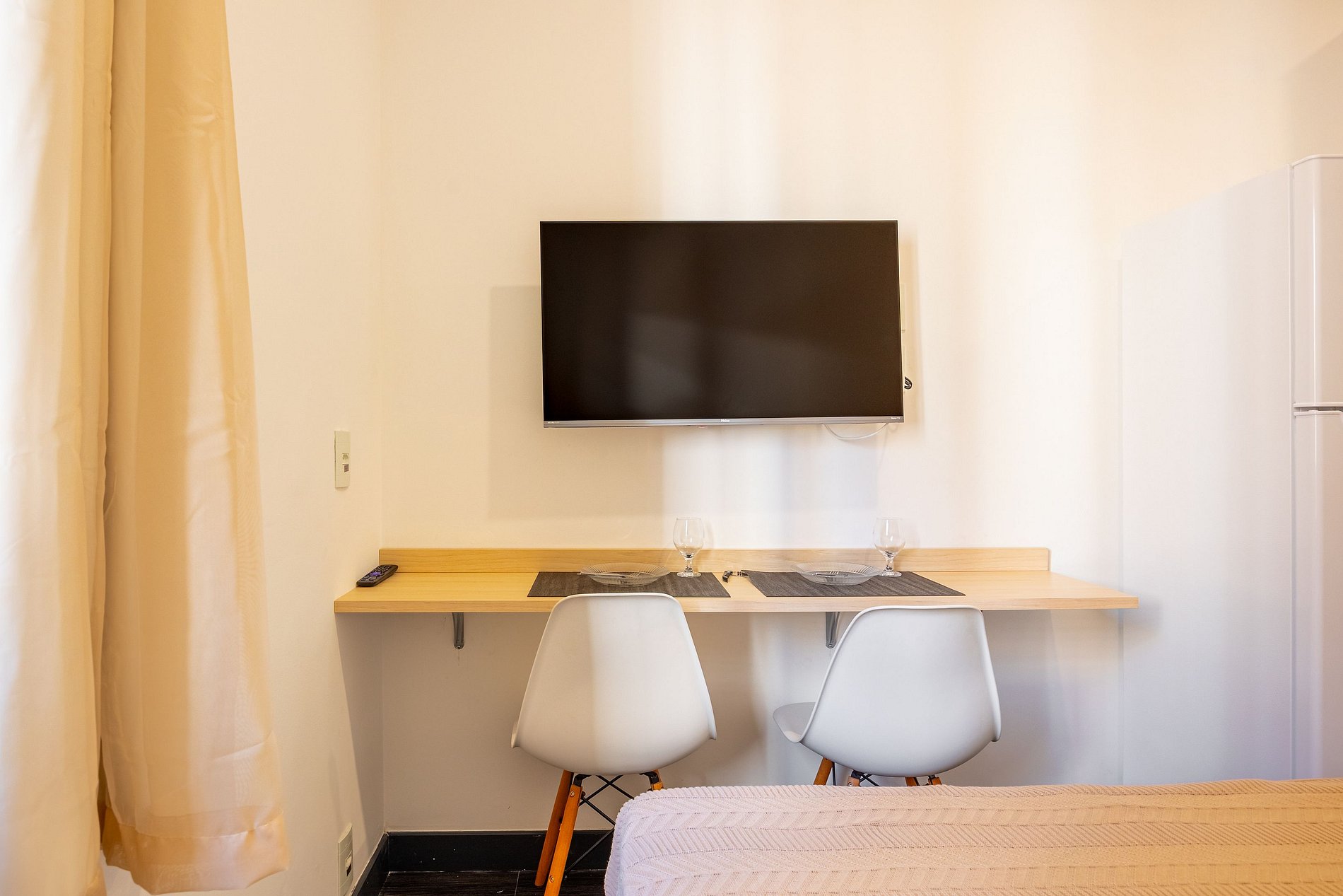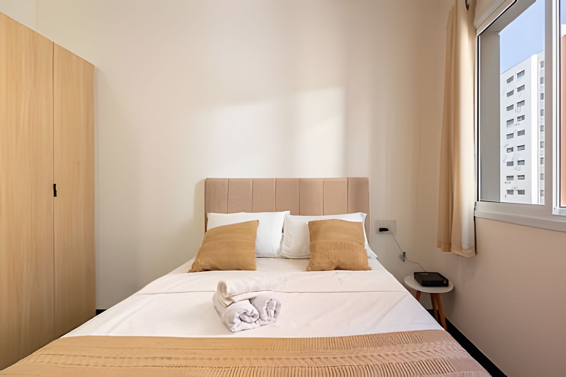 Cama confortável e espaço bem iluminado, com ambiente versátil para descanso ou trabalho;