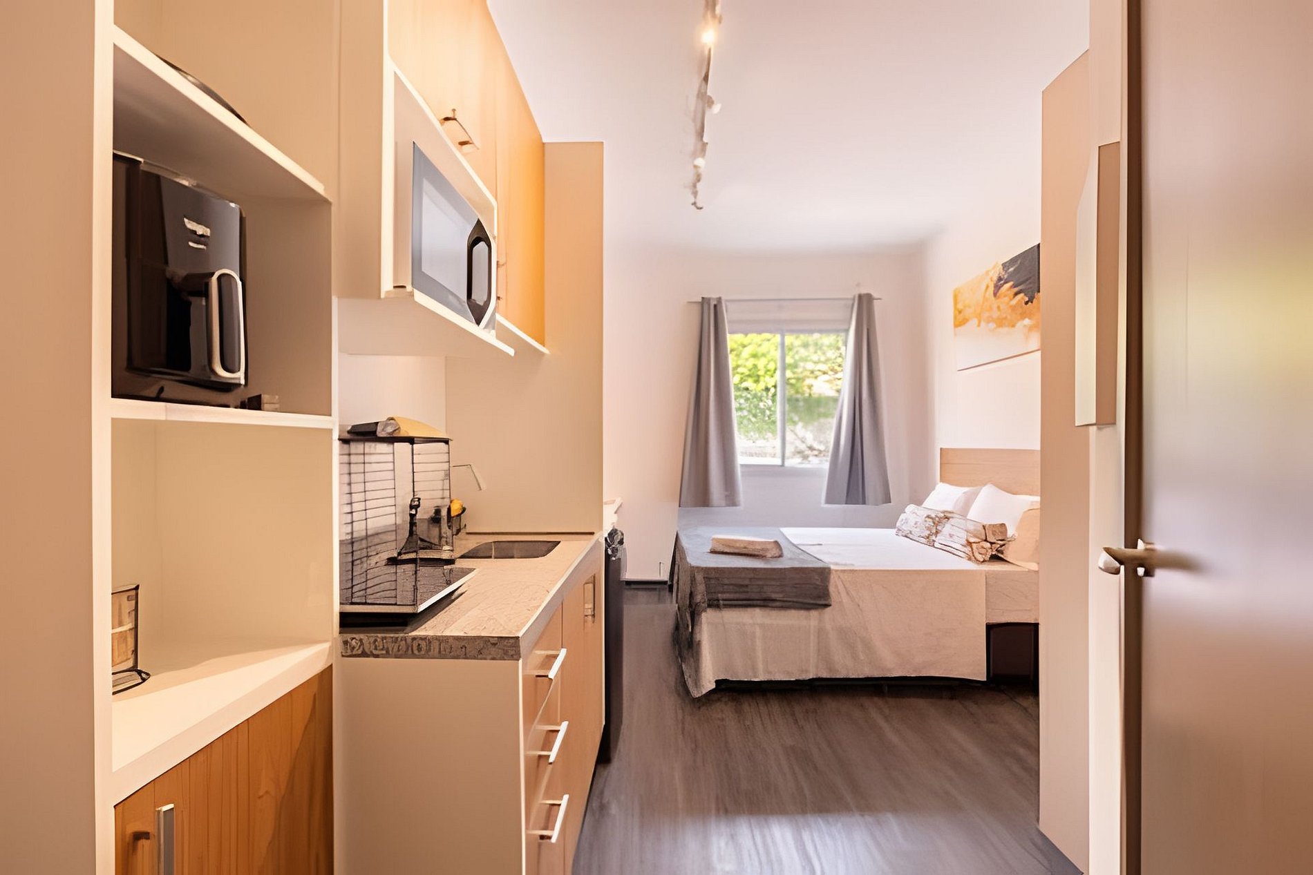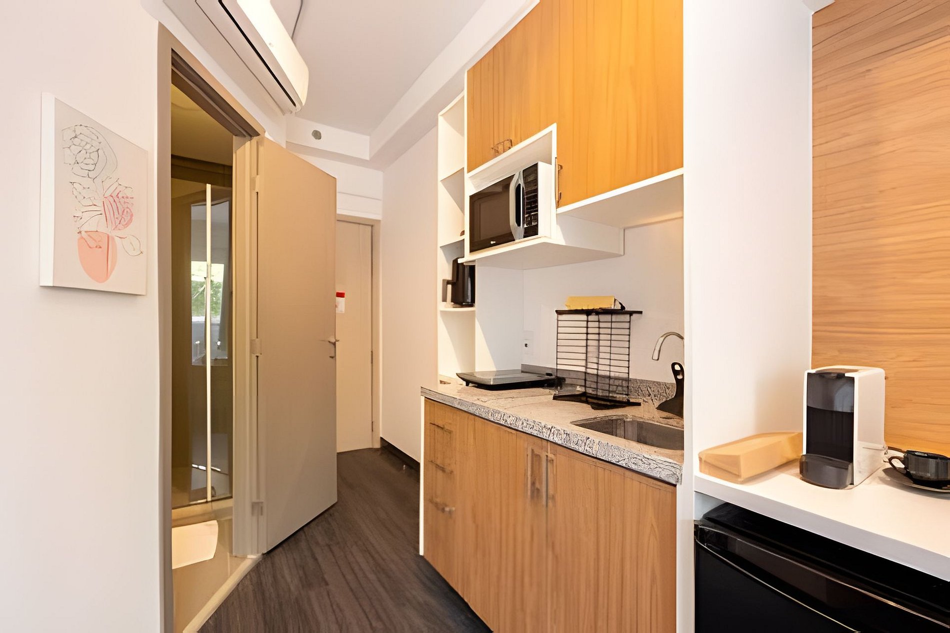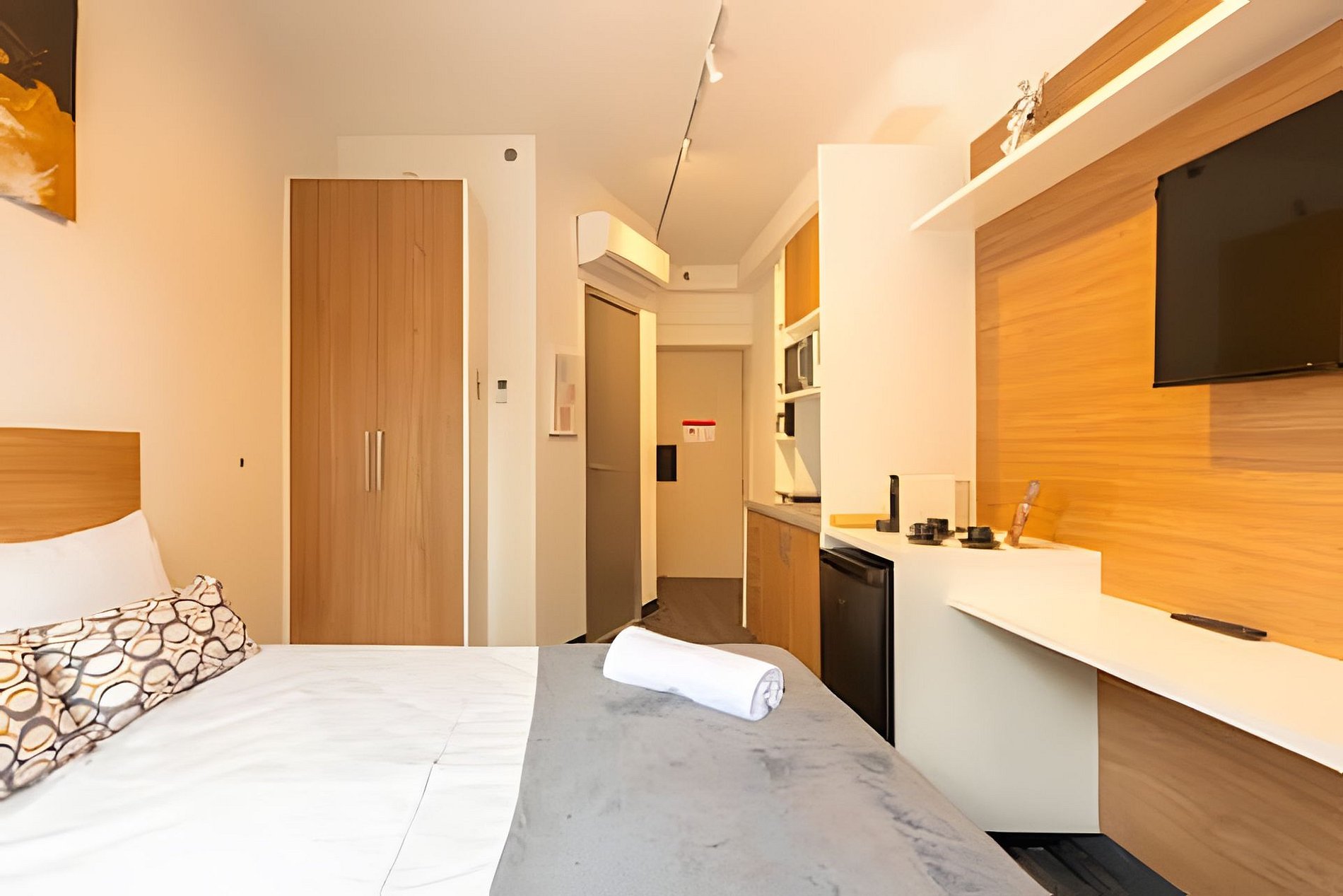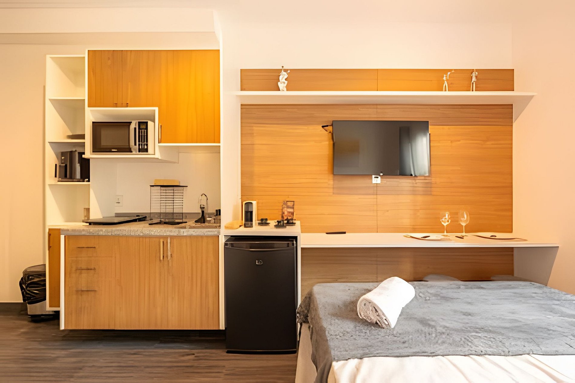 Estúdio estilo suíte com closet, cabideiro, geladeira e muitas outras comodidades. A região oferece uma grande variedade de lojas nas proximidades, além de lavanderia self-service dentro do condomínio (a um custo acessível). É um excelente espaço para quem precisa trabalhar em casa.