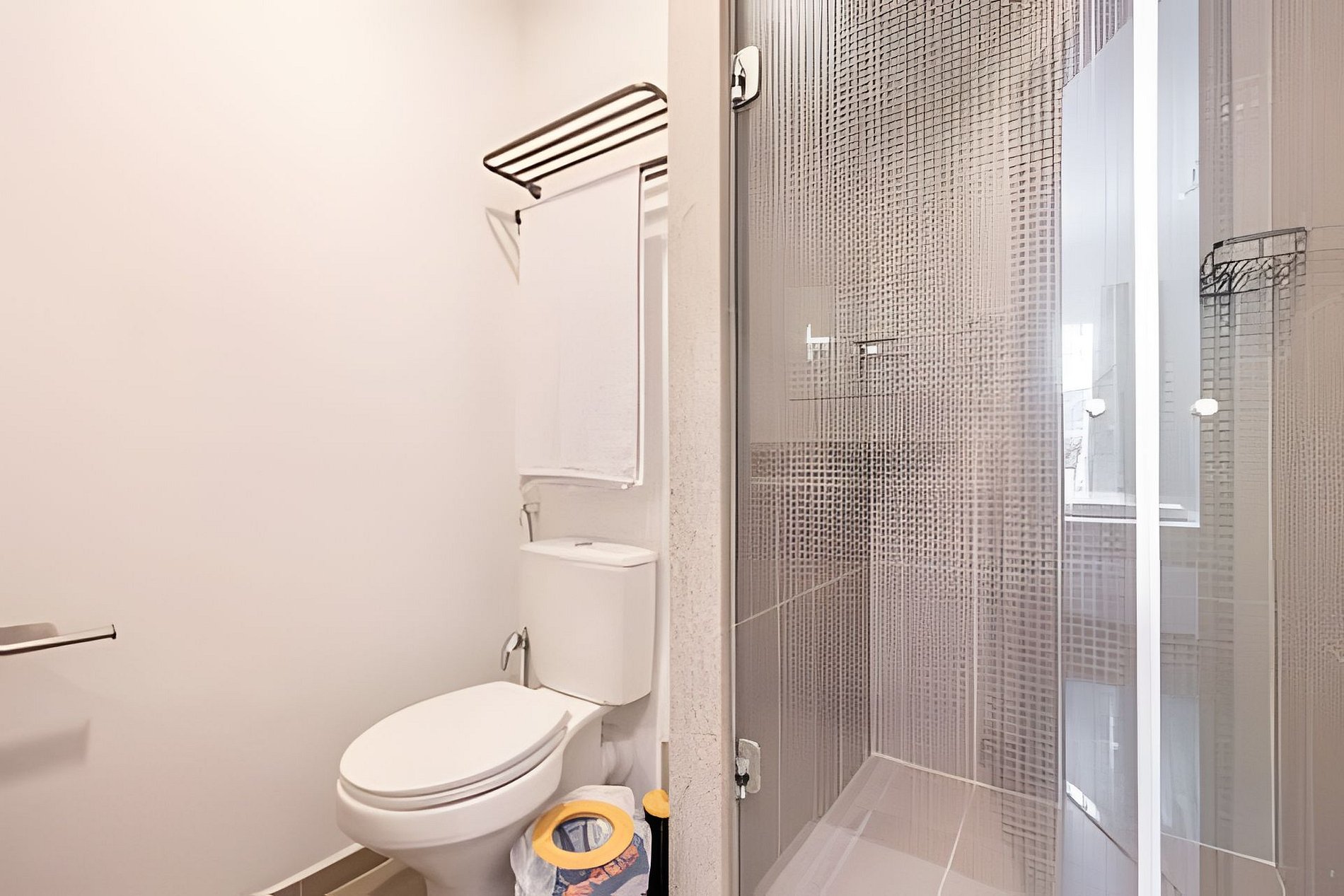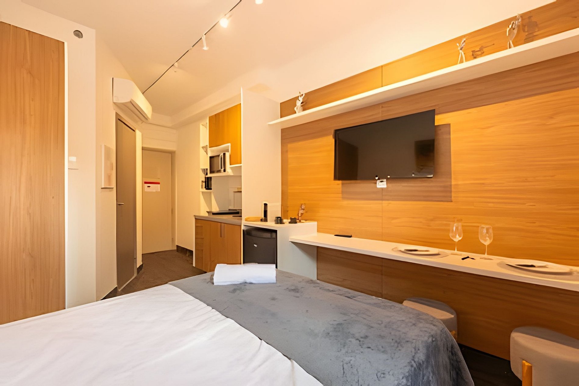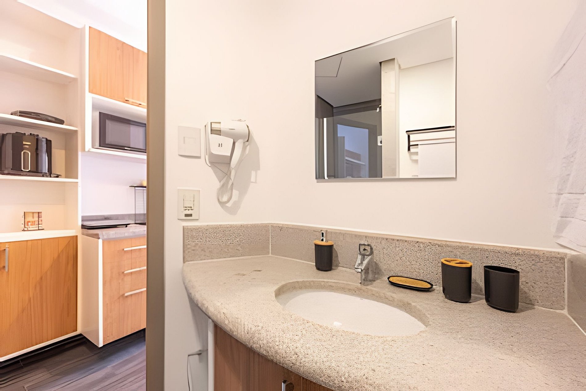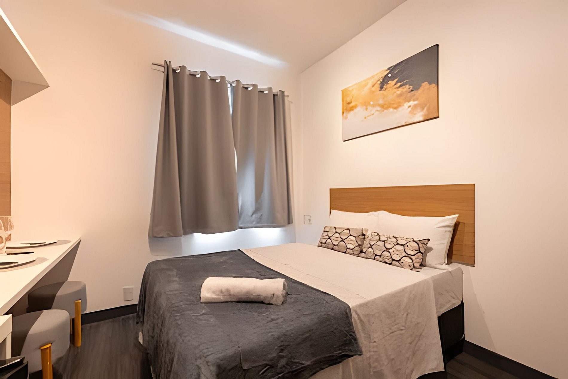 Estúdio estilo suíte com closet, cabideiro, geladeira e muitas outras comodidades. A região oferece uma grande variedade de lojas nas proximidades, além de lavanderia self-service dentro do condomínio (a um custo acessível). É um excelente espaço para quem precisa trabalhar em casa.