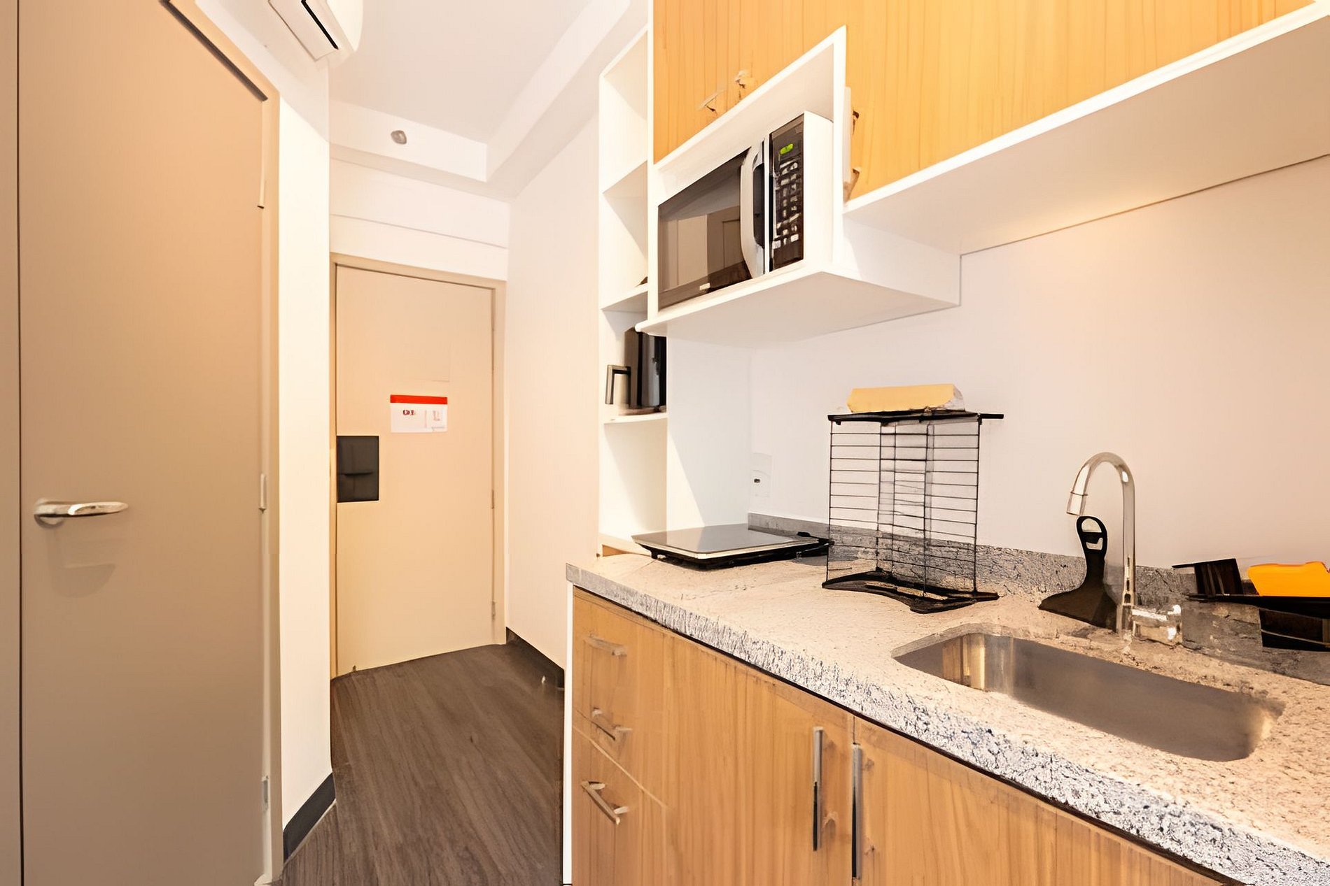 Estúdio estilo suíte com closet, cabideiro, geladeira e muitas outras comodidades. A região oferece uma grande variedade de lojas nas proximidades, além de lavanderia self-service dentro do condomínio (a um custo acessível). É um excelente espaço para quem precisa trabalhar em casa.