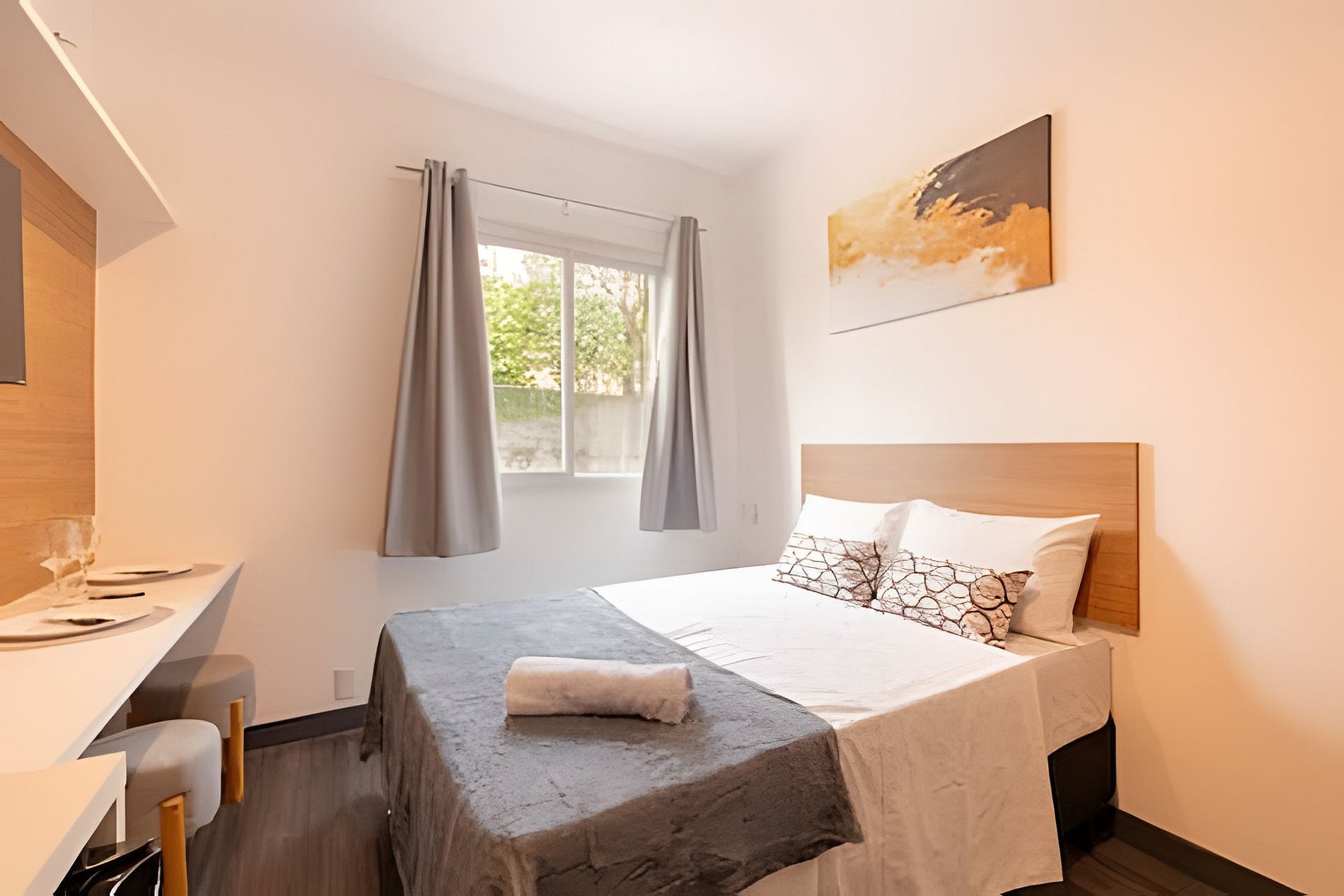 Estúdio estilo suíte com closet, cabideiro, geladeira e muitas outras comodidades. A região oferece uma grande variedade de lojas nas proximidades, além de lavanderia self-service dentro do condomínio (a um custo acessível). É um excelente espaço para quem precisa trabalhar em casa.