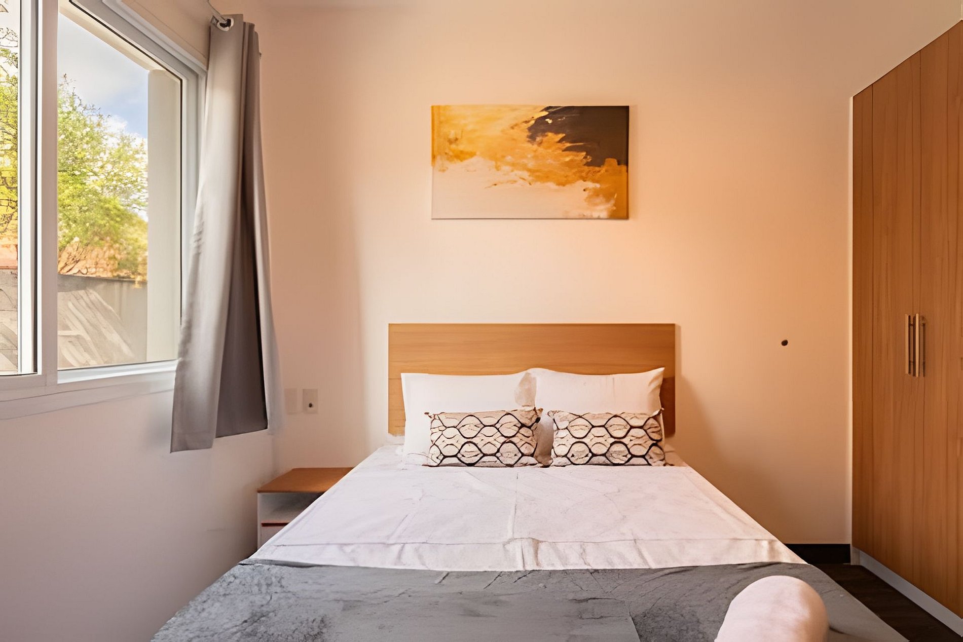 Cama confortável e espaço bem iluminado, com ambiente versátil para descanso ou trabalho;