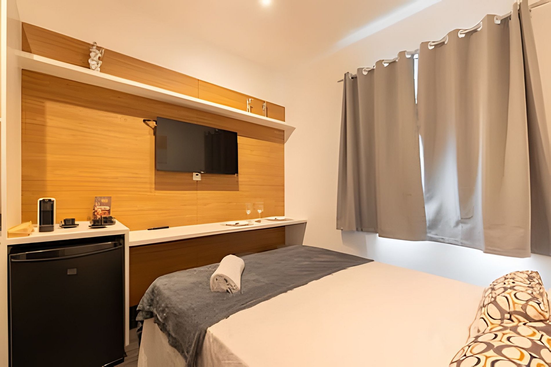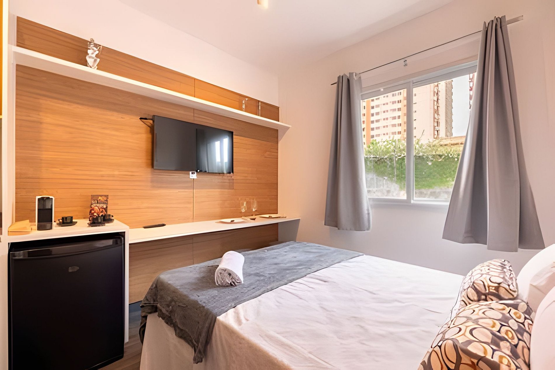 Cama confortável e espaço bem iluminado, com ambiente versátil para descanso ou trabalho;