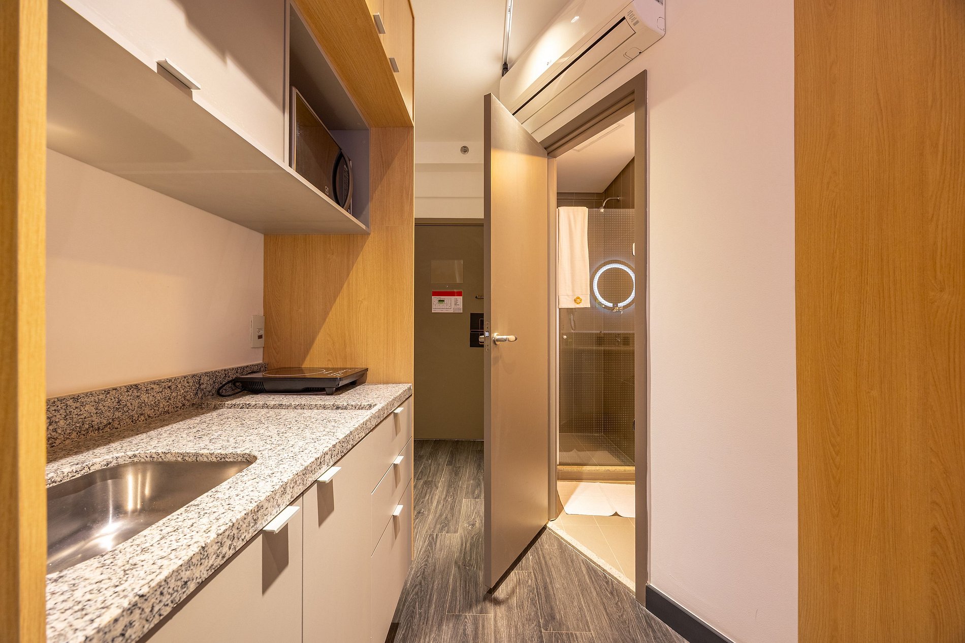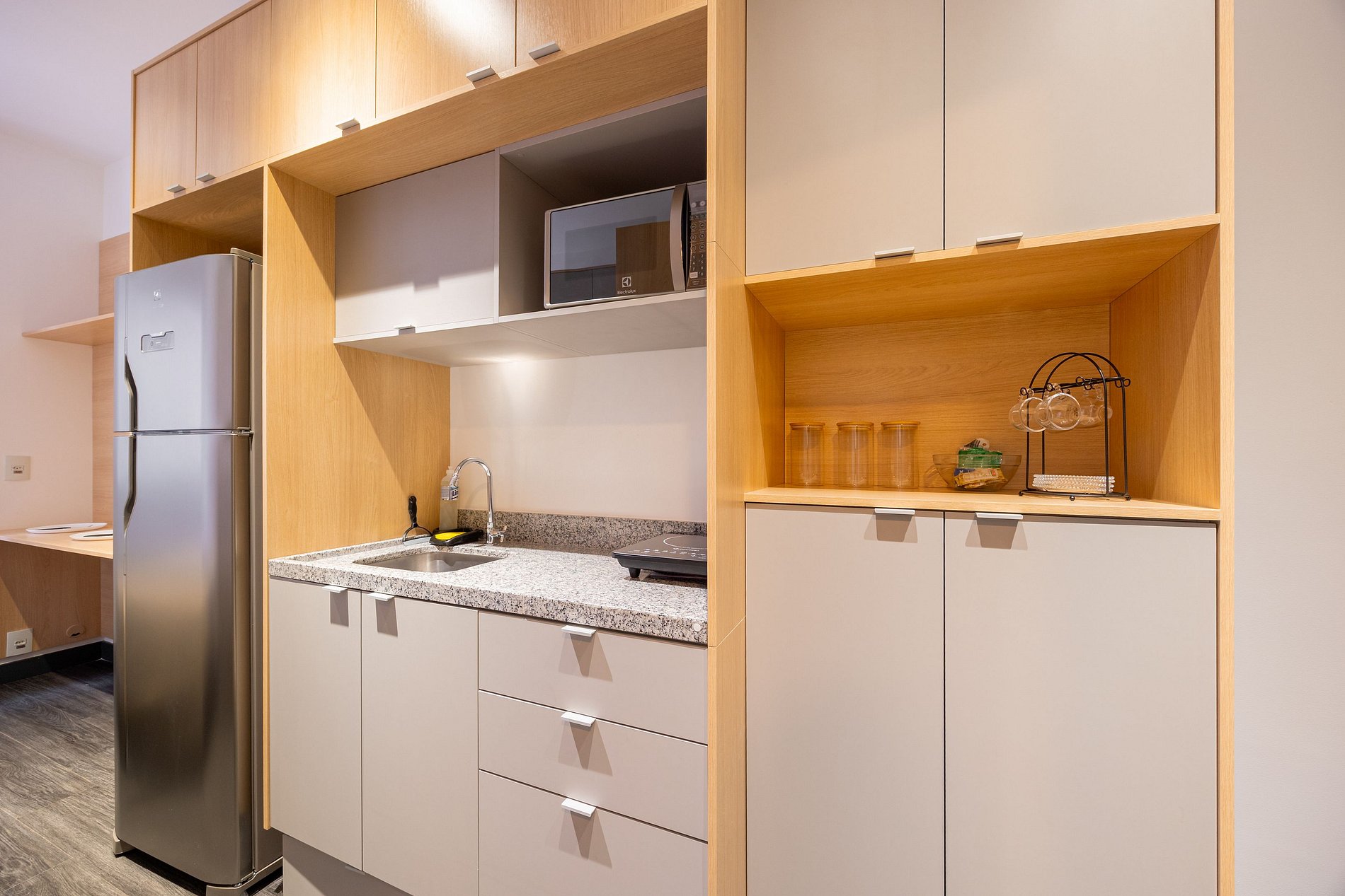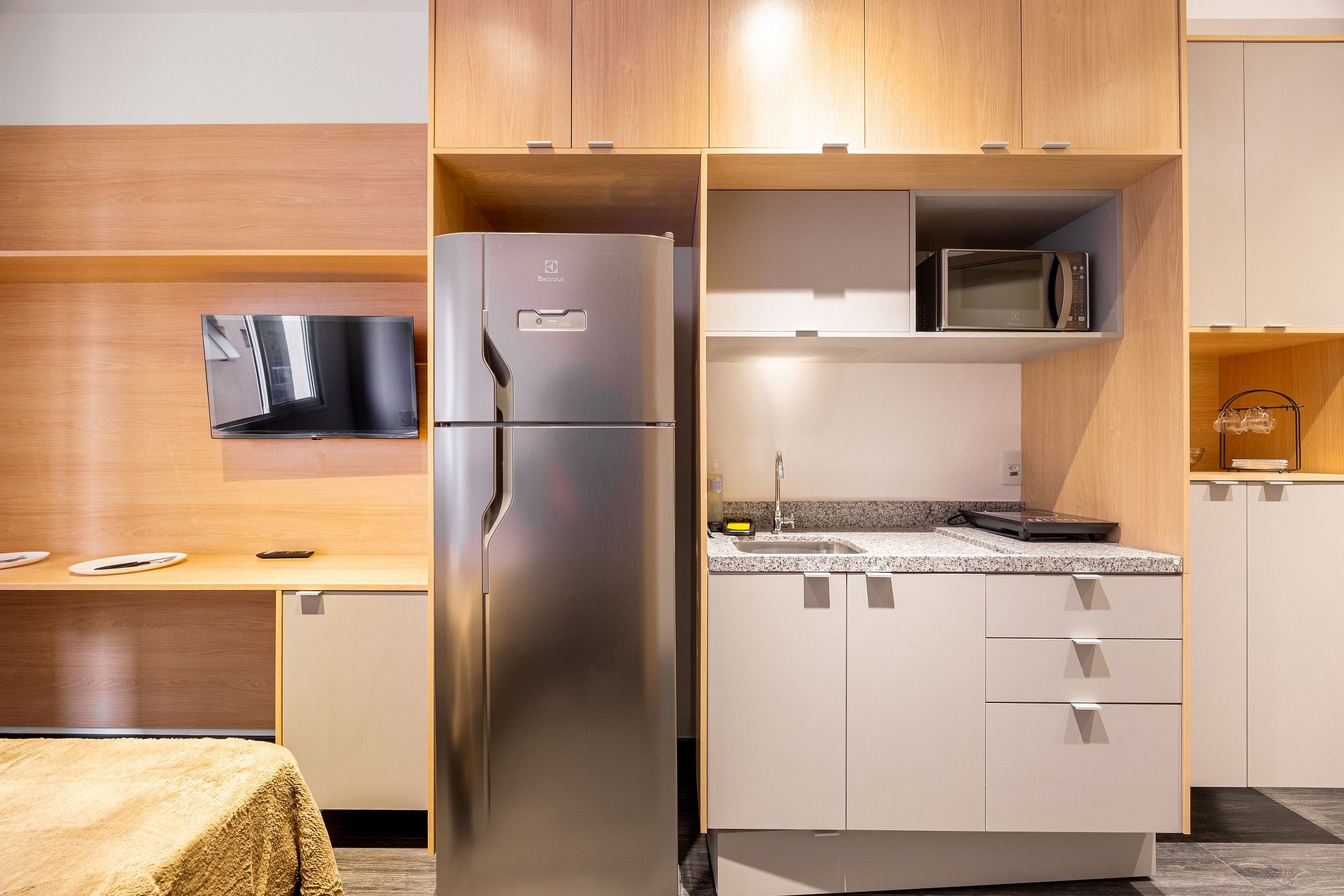 O Estudio é totalmente independente, não há compartilhamento de espaço ou internet com outras unidades, acesso a academia no andar térreo e Co-working com internet liberada.