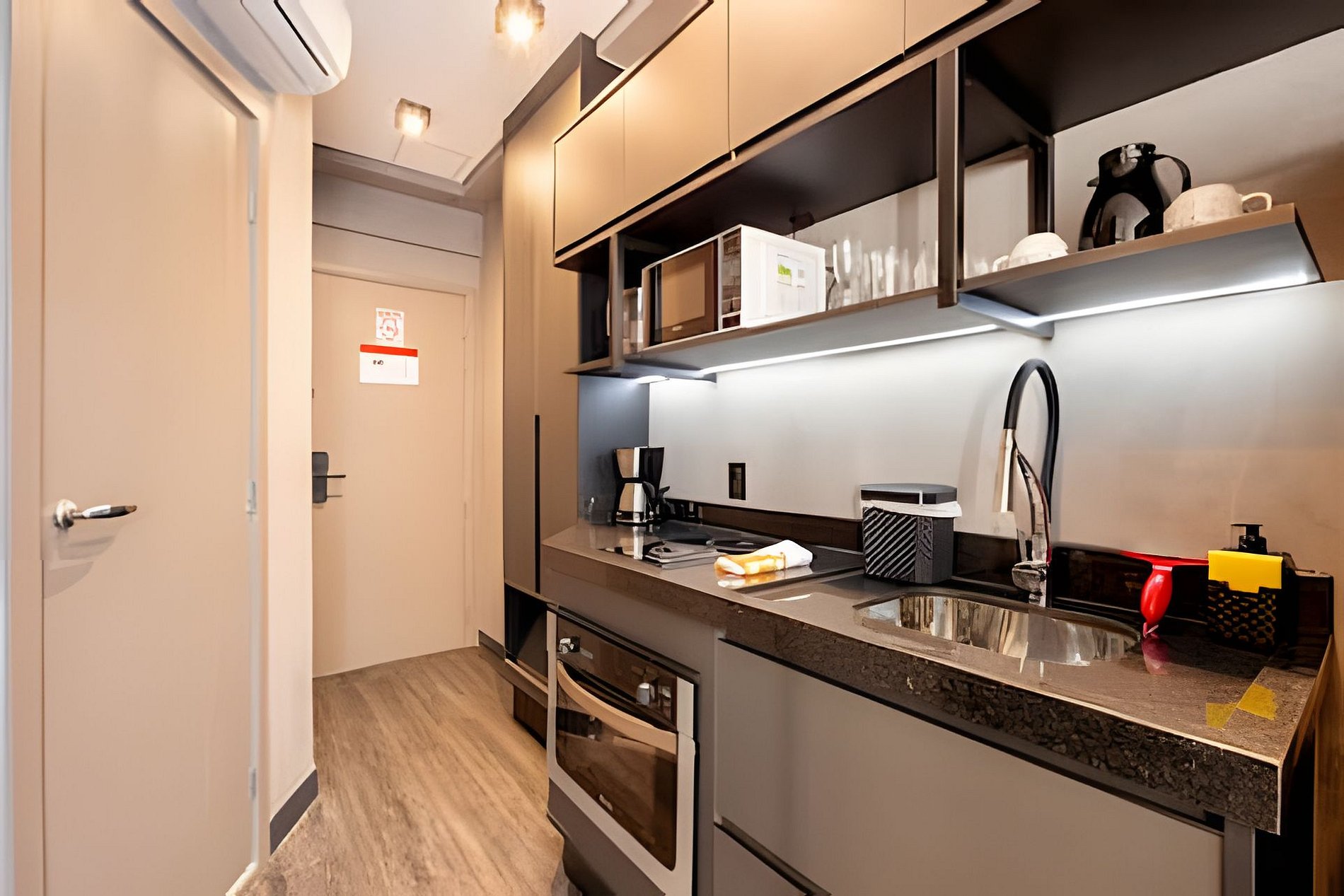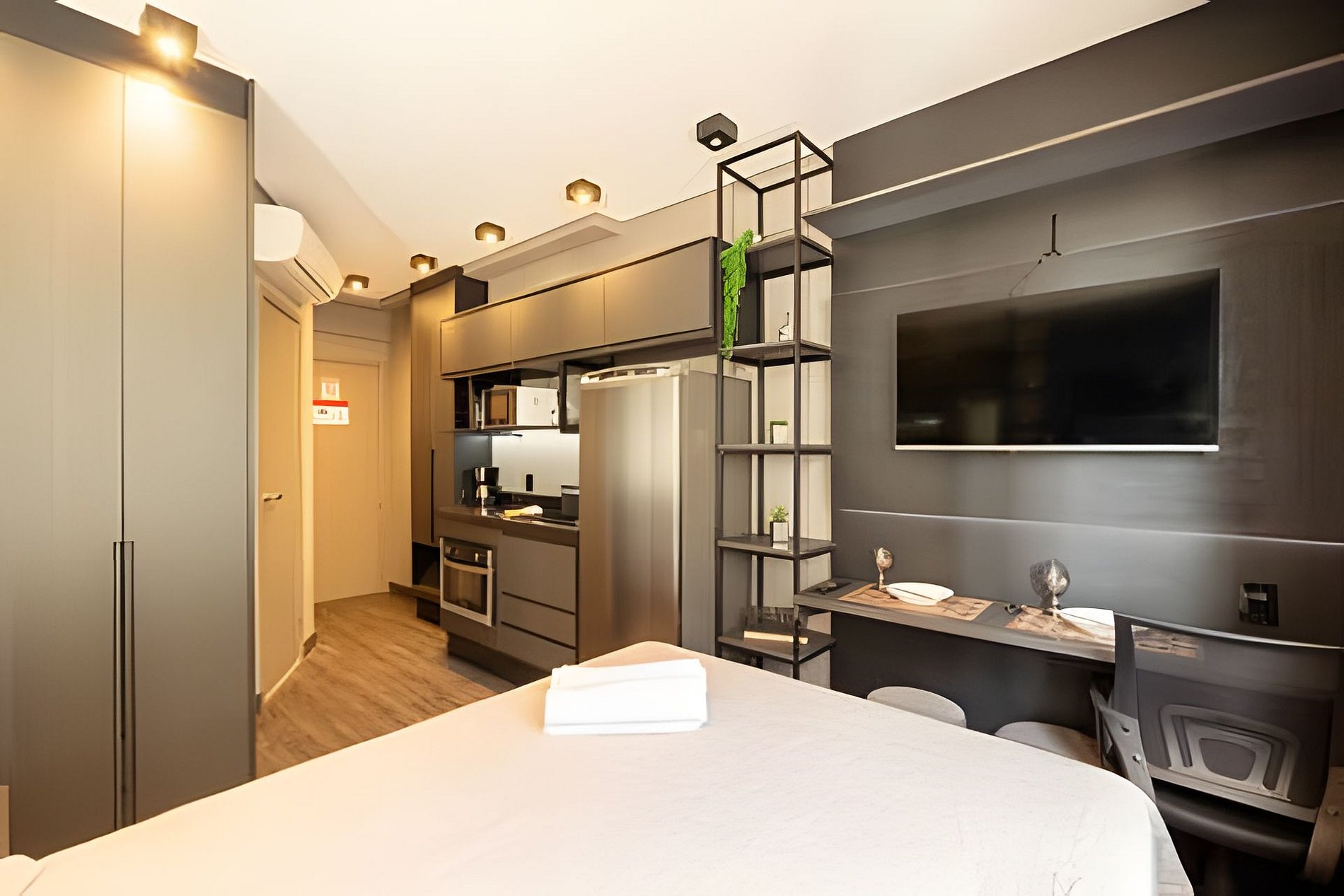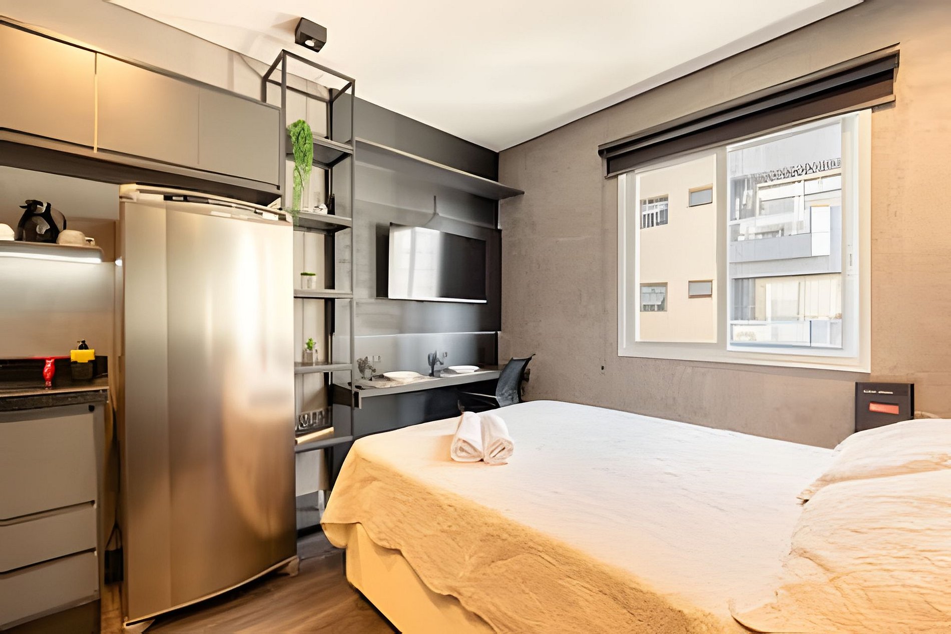 Estúdio no estilo suíte, totalmente equipado com estação de trabalho, closet, cabideiros, frigobar e diversas comodidades adicionais. A localização oferece fácil acesso a uma grande variedade de opções comerciais nas proximidades, além de contar com uma lavanderia self-service no próprio condomínio, a preços acessíveis. Um ambiente ideal para quem precisa de praticidade e conforto para trabalhar em home office.