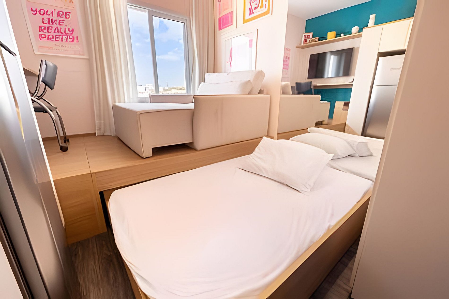 Estúdio estilo suíte, moderno e funcional, perfeito para quem busca conforto e praticidade. O espaço conta com closet, cabideiros, geladeira e diversas outras comodidades que garantem uma estadia agradável e eficiente. Ideal para estadias curtas ou longas, o ambiente foi pensado para oferecer bem-estar e organização no dia a dia.